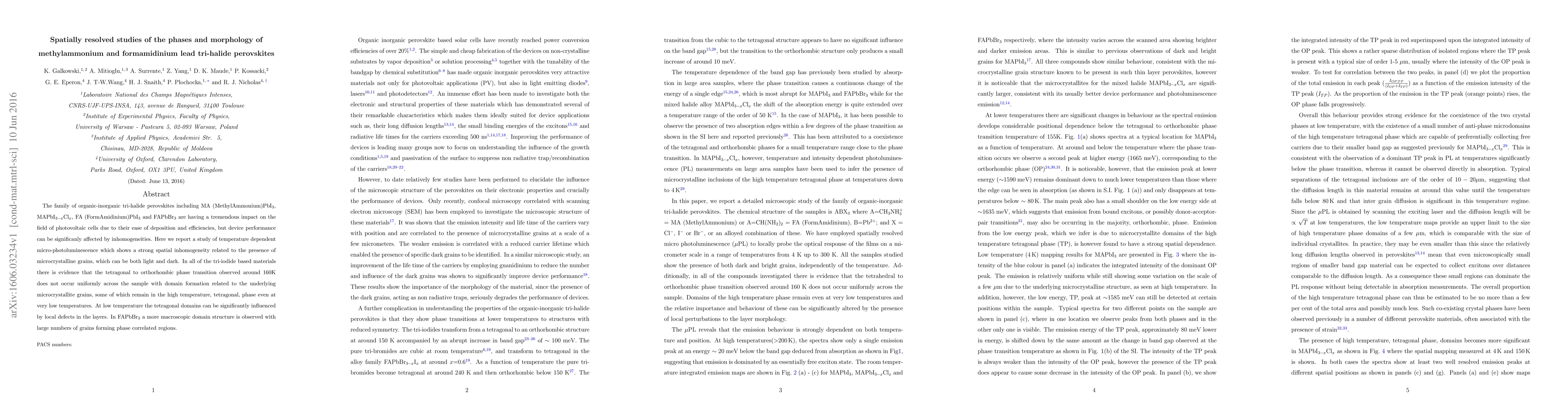 The family of organic-inorganic tri-halide perovskites including MA (MethylAmmonium)PbI$_{3}$, MAPbI$_{3-x}$Cl$_{x}$, FA (FormAmidinium)PbI$_{3}$ and FAPbBr$_{3}$ are having a tremendous impact on the field of photovoltaic cells due to their ease of deposition and efficiencies, but device performance can be significanly affected by inhomogeneities. Here we report a study of temperature dependent micro-photoluminescence which shows a strong spatial inhomogeneity related to the presence of microcrystalline grains, which can be both light and dark. In all of the tri-iodide based materials there is evidence that the tetragonal to orthorhombic phase transition observed around 160K does not occur uniformly across the sample with domain formation related to the underlying microcrystallite grains, some of which remain in the high temperature, tetragonal, phase even at very low temperatures. At low temperature the tetragonal domains can be significantly influenced by local defects in the layers. In FAPbBr$_{3}$ a more macroscopic domain structure is observed with large numbers of grains forming phase correlated regions.
