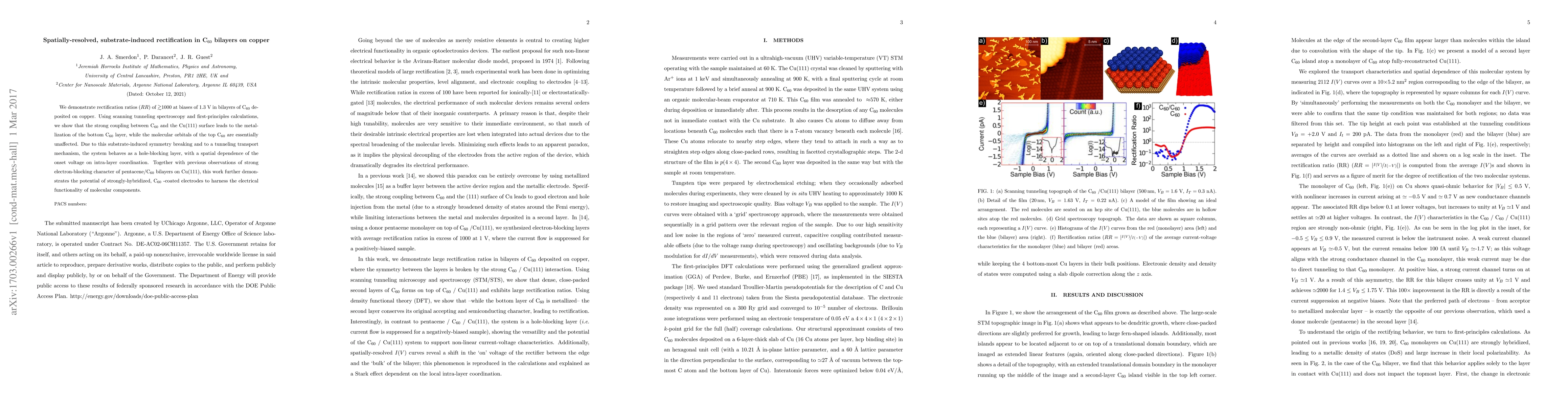 We demonstrate rectification ratios ($RR$) of $\gtrsim$1000 at biases of 1.3~V in bilayers of \buck deposited on copper. Using scanning tunneling spectroscopy and first-principles calculations, we show that the strong coupling between \buck and the Cu(111) surface leads to the metallization of the bottom \buck layer, while the molecular orbitals of the top \buck are essentially unaffected. Due to this substrate-induced symmetry breaking and to a tunneling transport mechanism, the system behaves as a hole-blocking layer, with a spatial dependence of the onset voltage on intra-layer coordination. Together with previous observations of strong electron-blocking character of pentacene/\buck bilayers on Cu(111), this work further demonstrates the potential of strongly-hybridized, \buck-coated electrodes to harness the electrical functionality of molecular components.