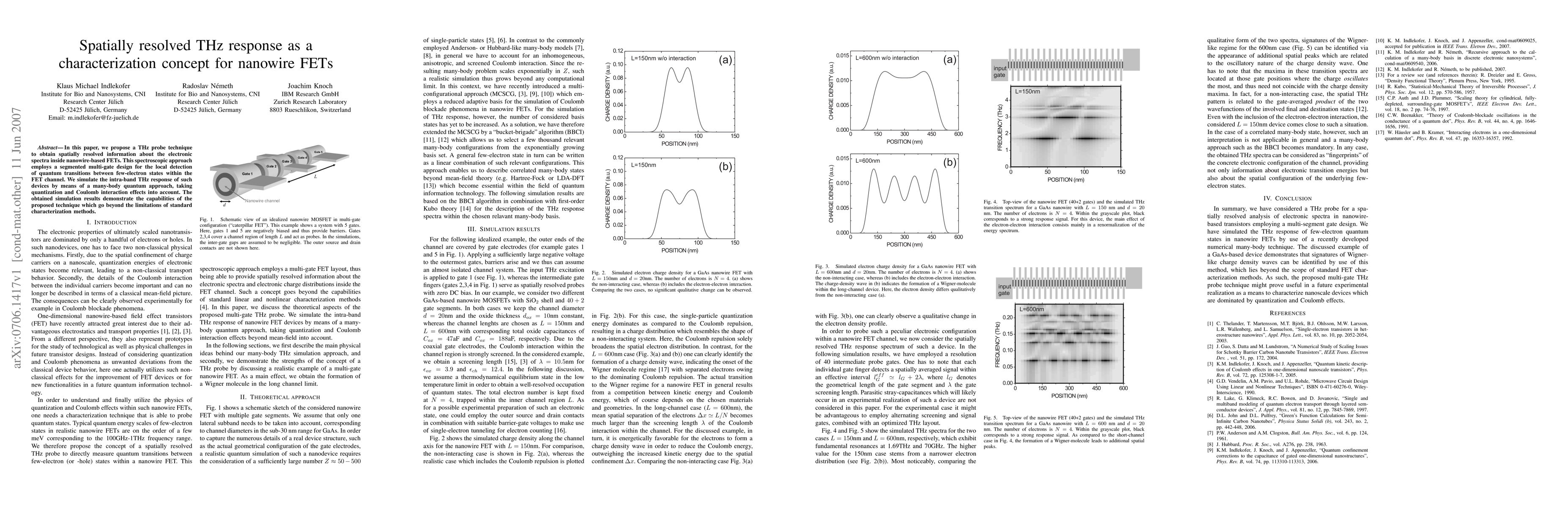 This paper introduces a THz probe technique for spatially resolved characterization of nanowire-based FETs, utilizing a segmented multi-gate design to detect quantum transitions. Simulations using a many-body quantum approach reveal the technique's potential to surpass standard characterization methods.