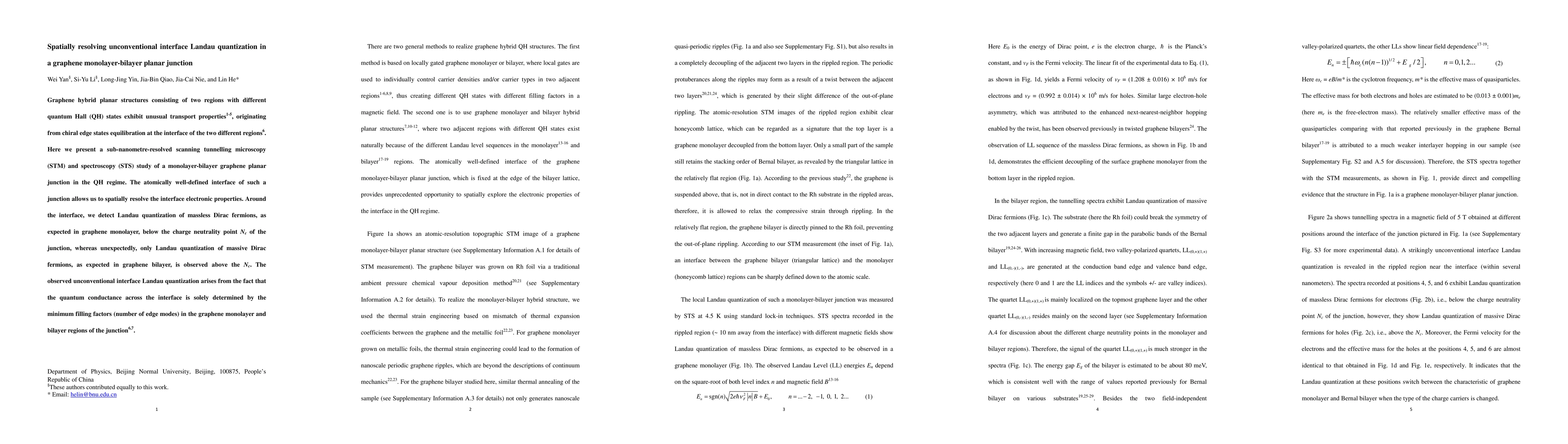 This study uses sub-nanometre-resolved STM and STS to examine a graphene monolayer-bilayer planar junction in the quantum Hall regime, revealing unconventional interface Landau quantization. Below the charge neutrality point, Landau quantization of massless Dirac fermions is observed, whereas above it, only massive Dirac fermions' Landau quantization appears, indicating unique conductance dynamics.