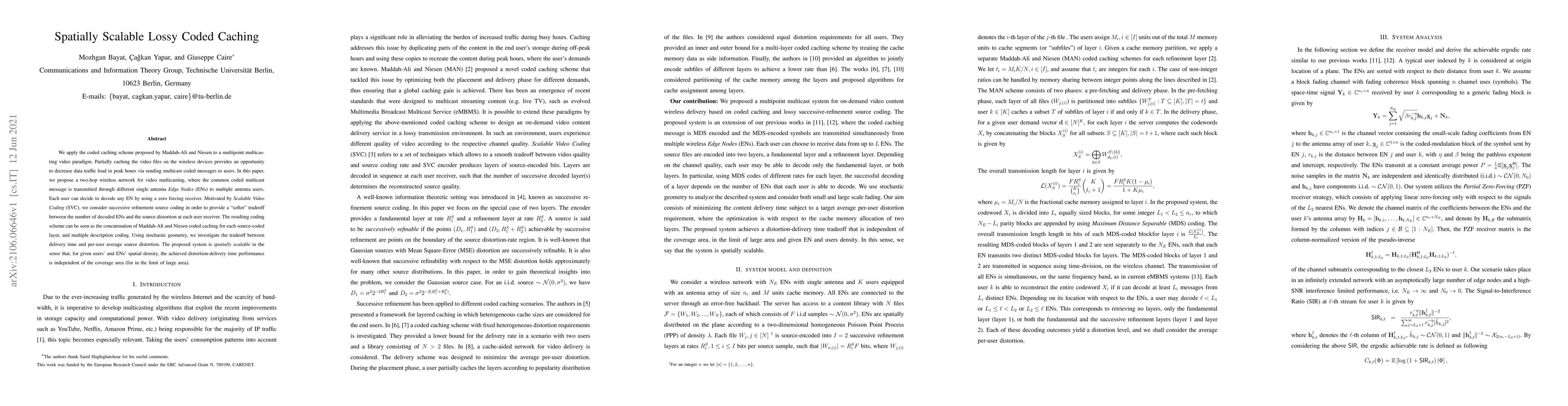 We apply the coded caching scheme proposed by Maddah-Ali and Niesen to a multipoint multicasting video paradigm. Partially caching the video files on the wireless devices provides an opportunity to decrease data traffic load in peak hours via sending multicast coded messages to users. In this paper, we propose a two-hop wireless network for video multicasting, where the common coded multicast message is transmitted through different single antenna Edge Nodes (ENs) to multiple antenna users. Each user can decide to decode any EN by using a zero forcing receiver. Motivated by Scalable Video Coding (SVC), we consider successive refinement source coding in order to provide a ``softer'' tradeoff between the number of decoded ENs and the source distortion at each user receiver. The resulting coding scheme can be seen as the concatenation of Maddah-Ali and Niesen coded caching for each source-coded layer, and multiple description coding. Using stochastic geometry, we investigate the tradeoff between delivery time and per-user average source distortion. The proposed system is spatially scalable in the sense that, for given users' and ENs' spatial density, the achieved distortion-delivery time performance is independent of the coverage area (for in the limit of large area).