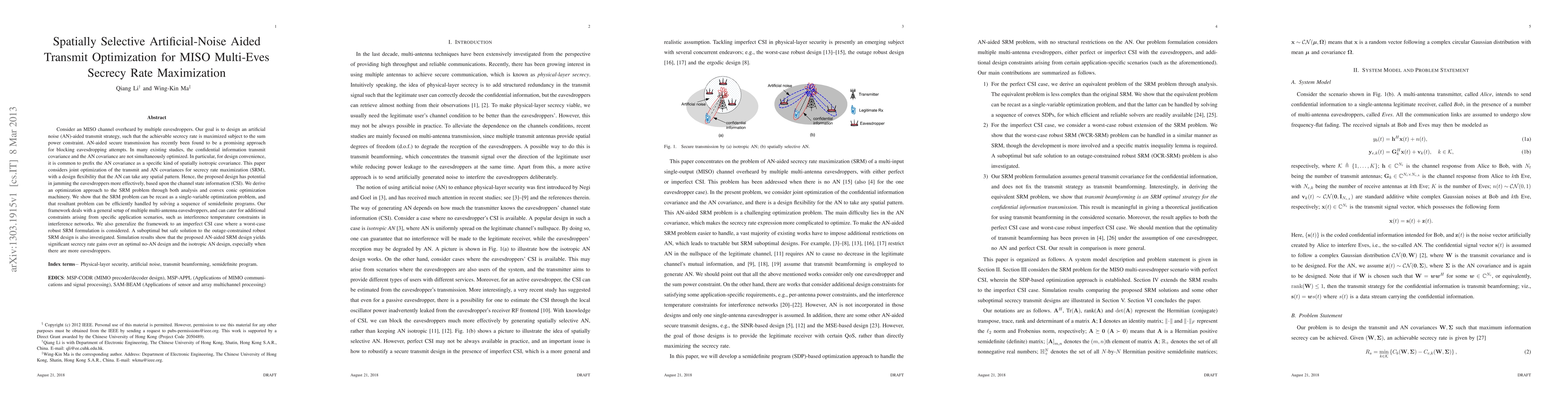 This paper proposes an artificial noise (AN)-aided transmit optimization strategy for MISO channels with multiple eavesdroppers to maximize the secrecy rate. Unlike previous methods, it jointly optimizes the transmit and AN covariance matrices, allowing for spatially selective AN patterns, thereby potentially jamming eavesdroppers more effectively. The authors derive an optimization approach recasting the problem into a single-variable optimization solvable via semidefinite programs, and demonstrate significant secrecy rate gains over conventional methods.