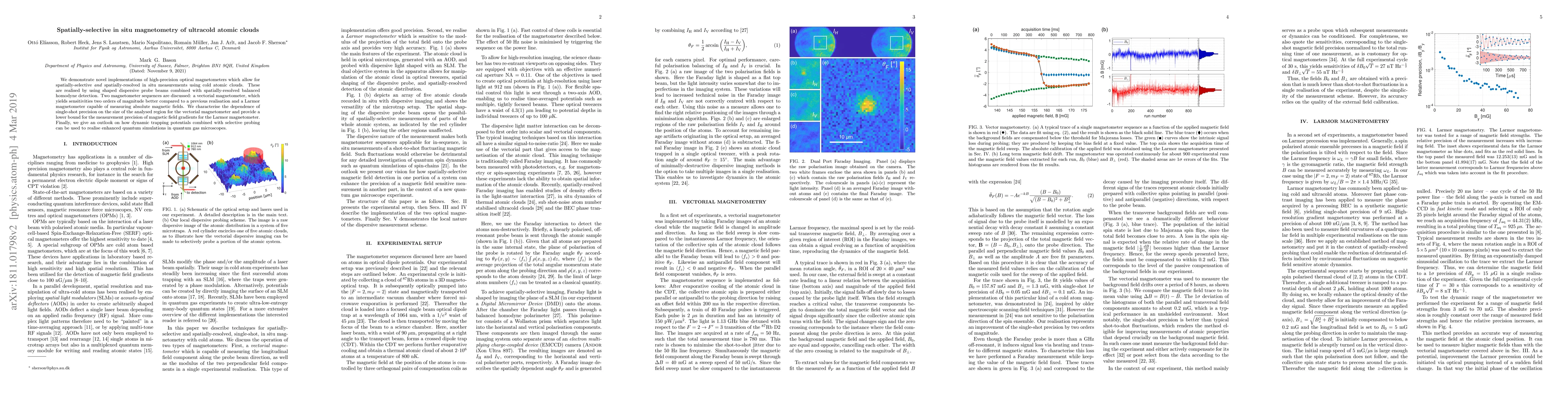 We demonstrate novel implementations of high-precision optical magnetometers which allow for spatially-selective and spatially-resolved in situ measurements using cold atomic clouds. These are realised by using shaped dispersive probe beams combined with spatially-resolved balanced homodyne detection. Two magnetometer sequences are discussed: a vectorial magnetometer, which yields sensitivities two orders of magnitude better compared to a previous realisation and a Larmor magnetometer capable of measuring absolute magnetic fields. We characterise the dependence of single-shot precision on the size of the analysed region for the vectorial magnetometer and provide a lower bound for the measurement precision of magnetic field gradients for the Larmor magnetometer. Finally, we give an outlook on how dynamic trapping potentials combined with selective probing can be used to realise enhanced quantum simulations in quantum gas microscopes.