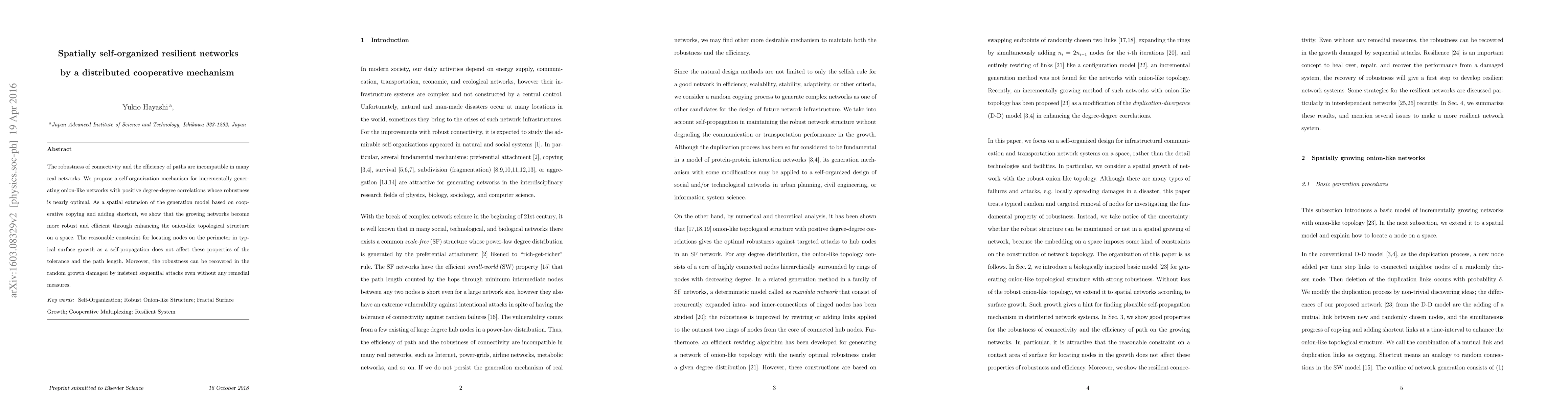 This research introduces a self-organization mechanism for creating robust and efficient networks, called onion-like networks, which balance connectivity robustness and path efficiency. The method involves cooperative copying and adding shortcuts, enhancing topological structure on a space without affecting tolerance and path length. Notably, these networks retain robustness even after damage from sequential attacks, demonstrating resilience without remedial measures.