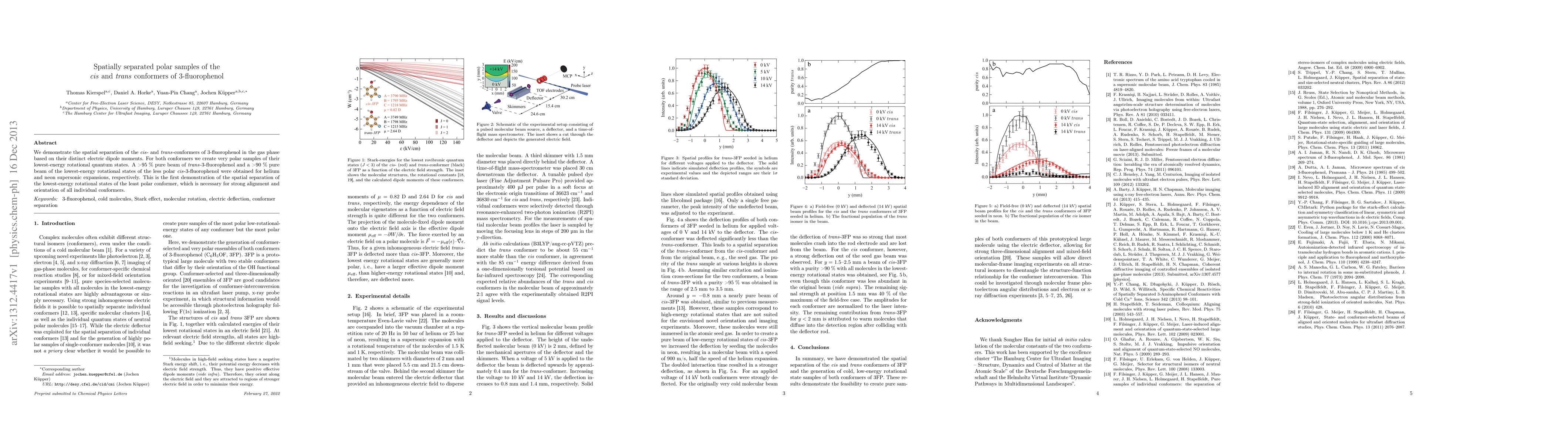 This research demonstrates the spatial separation of cis- and trans-conformers of 3-fluorophenol in gas phase using their distinct electric dipole moments, achieving >95% purity for trans and >90% for cis in supersonic expansions. This is the first successful separation of the lowest-energy rotational states of the less polar cis conformer.
