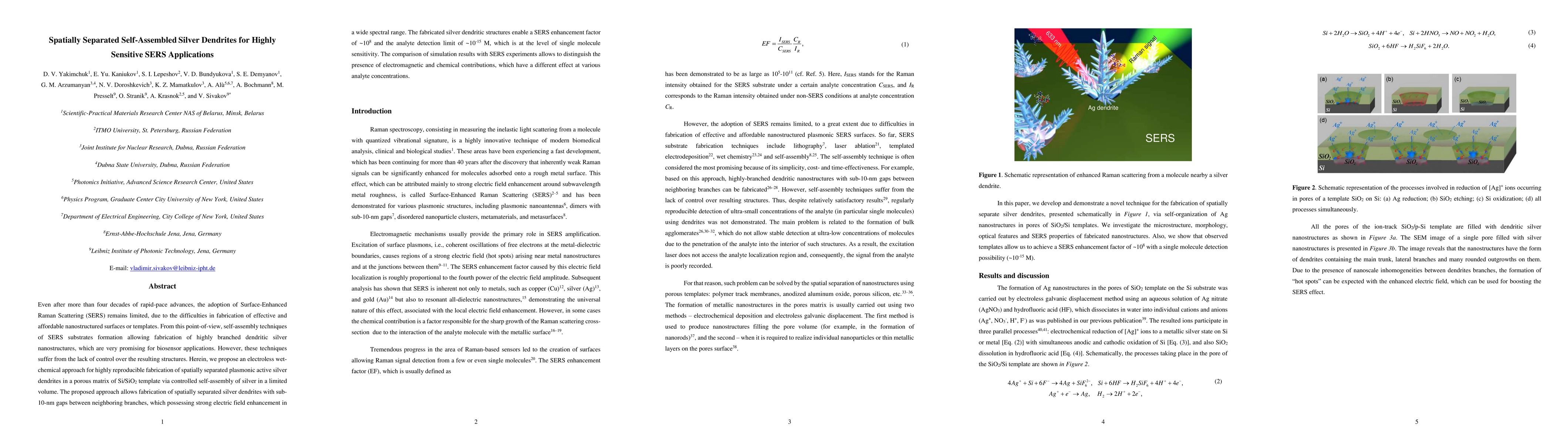 The paper introduces an electroless wet-chemical approach for the reproducible fabrication of spatially separated silver dendrites with strong electric field enhancement, leading to high SERS sensitivity.