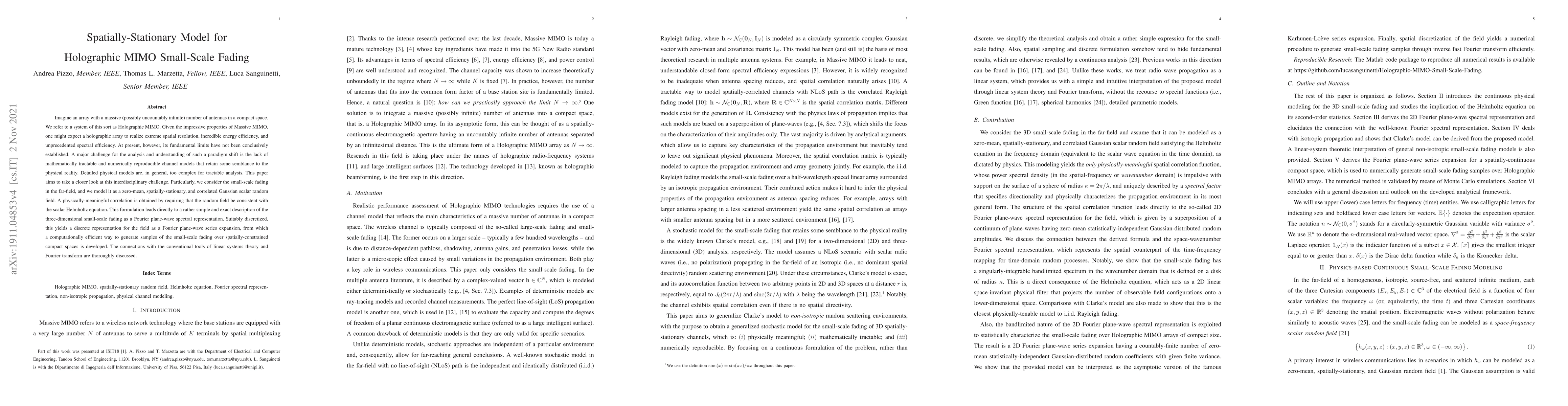 Imagine an array with a massive (possibly uncountably infinite) number of antennas in a compact space. We refer to a system of this sort as Holographic MIMO. Given the impressive properties of Massive MIMO, one might expect a holographic array to realize extreme spatial resolution, incredible energy efficiency, and unprecedented spectral efficiency. At present, however, its fundamental limits have not been conclusively established. A major challenge for the analysis and understanding of such a paradigm shift is the lack of mathematically tractable and numerically reproducible channel models that retain some semblance to the physical reality. Detailed physical models are, in general, too complex for tractable analysis. This paper aims to take a closer look at this interdisciplinary challenge. Particularly, we consider the small-scale fading in the far-field, and we model it as a zero-mean, spatially-stationary, and correlated Gaussian scalar random field. Physically-meaningful correlation is obtained by requiring that the random field be consistent with the scalar Helmholtz equation. This formulation leads directly to a rather simple and exact description of the three-dimensional small-scale fading as a Fourier plane-wave spectral representation. Suitably discretized, this leads to a discrete representation for the field as a Fourier plane-wave series expansion, from which a computationally efficient way to generate samples of the small-scale fading over spatially-constrained compact spaces is developed. The connections with the conventional tools of linear systems theory and Fourier transform are thoroughly discussed.