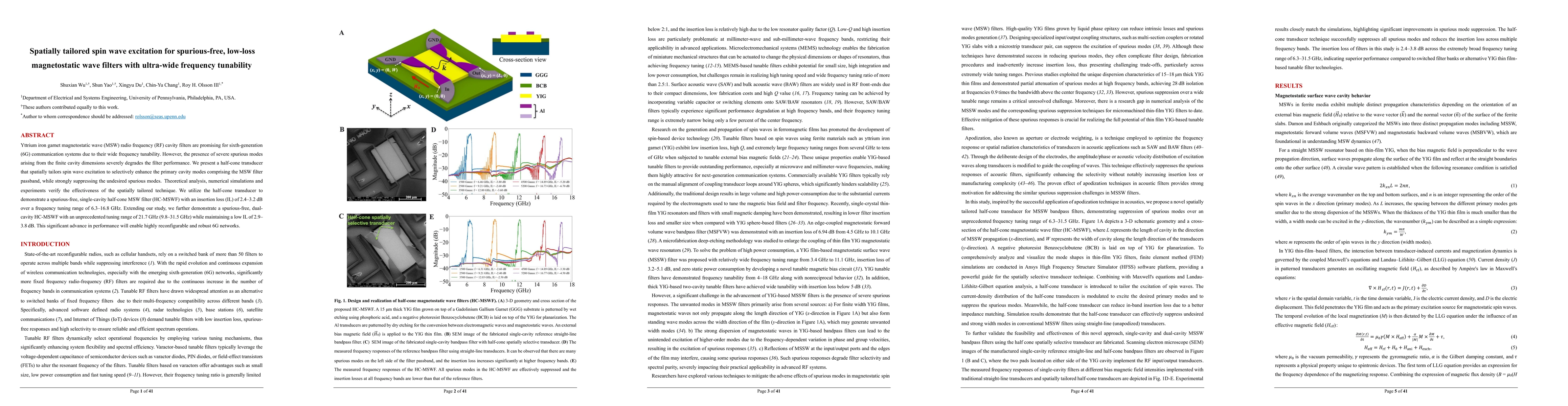 Yttrium iron garnet magnetostatic wave (MSW) radio frequency (RF) cavity filters are promising for sixth-generation (6G) communication systems due to their wide frequency tunability. However, the presence of severe spurious modes arising from the finite cavity dimensions severely degrades the filter performance. We present a half-cone transducer that spatially tailors spin wave excitation to selectively enhance the primary cavity modes comprising the MSW filter passband, while strongly suppressing the undesired spurious modes. Theoretical analysis, numerical simulations and experiments verify the effectiveness of the spatially tailored technique. We utilize the half-cone transducer to demonstrate a spurious-free, single-cavity half-cone MSW filter (HC-MSWF) with an insertion loss (IL) of 2.4-3.2 dB over a frequency tuning range of 6.3-16.8 GHz. Extending our study, we further demonstrate a spurious-free, dual-cavity HC-MSWF with an unprecedented tuning range of 21.7 GHz (9.8-31.5 GHz) while maintaining a low IL of 2.9-3.8 dB. This significant advance in performance will enable highly reconfigurable and robust 6G networks.