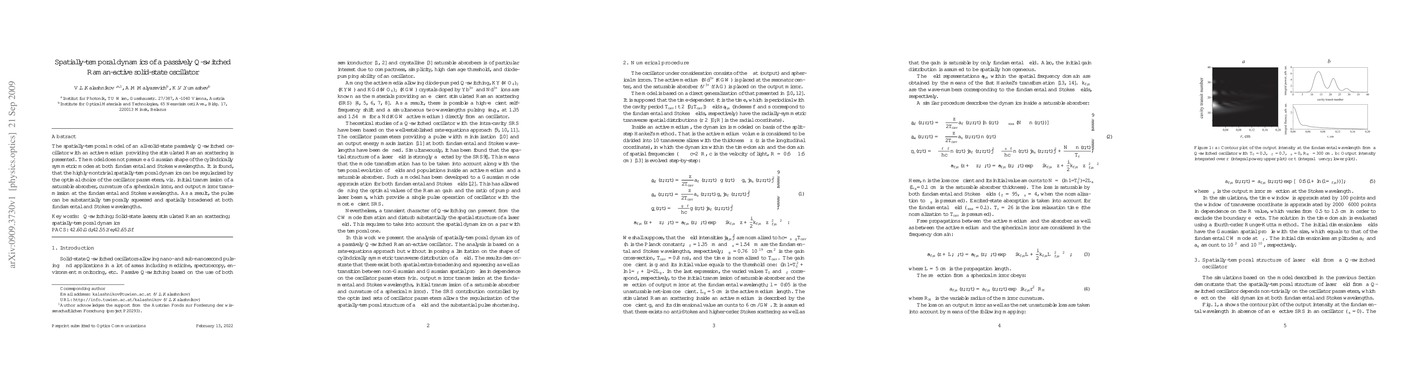 The spatially-temporal model of an all-solid-state passively Q-switched oscillator with an active medium providing the stimulated Raman scattering is presented. The model does not presume a Gaussian shape of the cylindrically symmetric modes at both fundamental and Stokes wavelengths. It is found, that the highly-nontrivial spatially-temporal dynamics can be regularized by the optimal choice of the oscillator parameters, viz. initial transmission of a saturable absorber, curvature of a spherical mirror, and output mirror transmission at the fundamental and Stokes wavelengths. As a result, the pulse can be substantially temporally squeezed and spatially broadened at both fundamental and Stokes wavelengths.