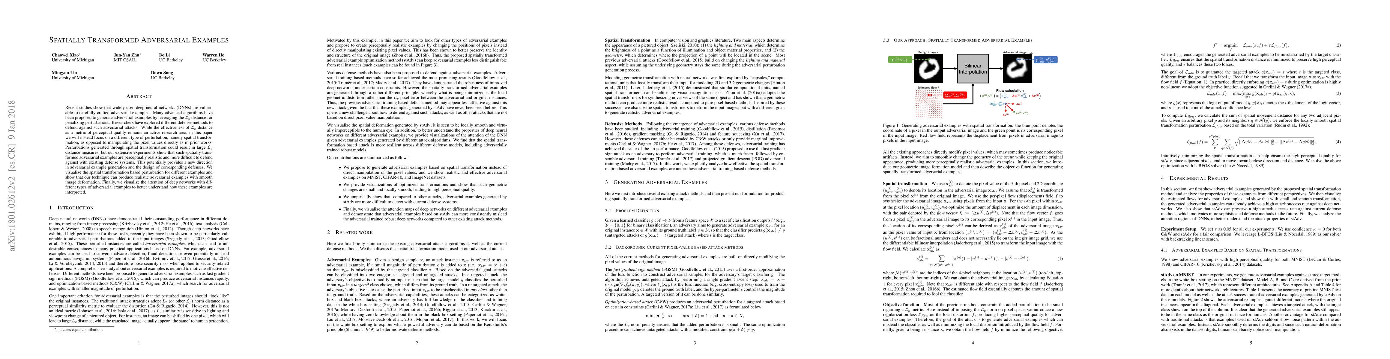 This paper explores generating adversarial examples through spatial transformations rather than direct pixel manipulations, demonstrating that these transformations create perceptually realistic examples that are harder to defend against than traditional adversarial attacks. The study highlights the potential for new adversarial techniques and defense strategies.