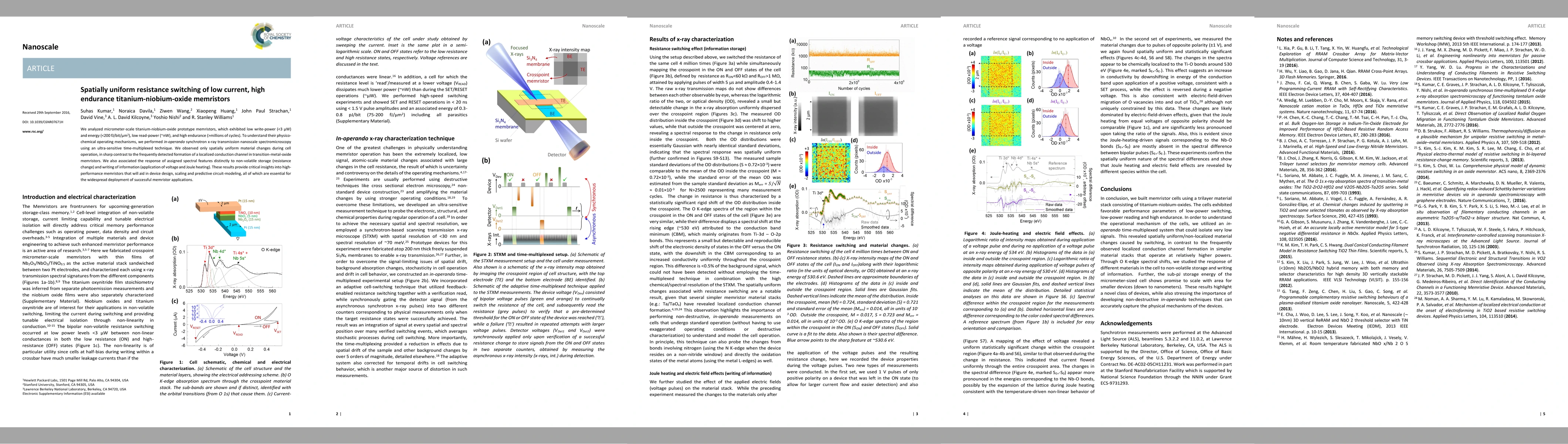 This paper investigates low-current, high-endurance titanium-niobium-oxide memristors, revealing low power consumption and high endurance. In-operando synchrotron x-ray microscopy identified spatially uniform resistance switching without localized conduction channels, offering insights for memristor design and modeling.