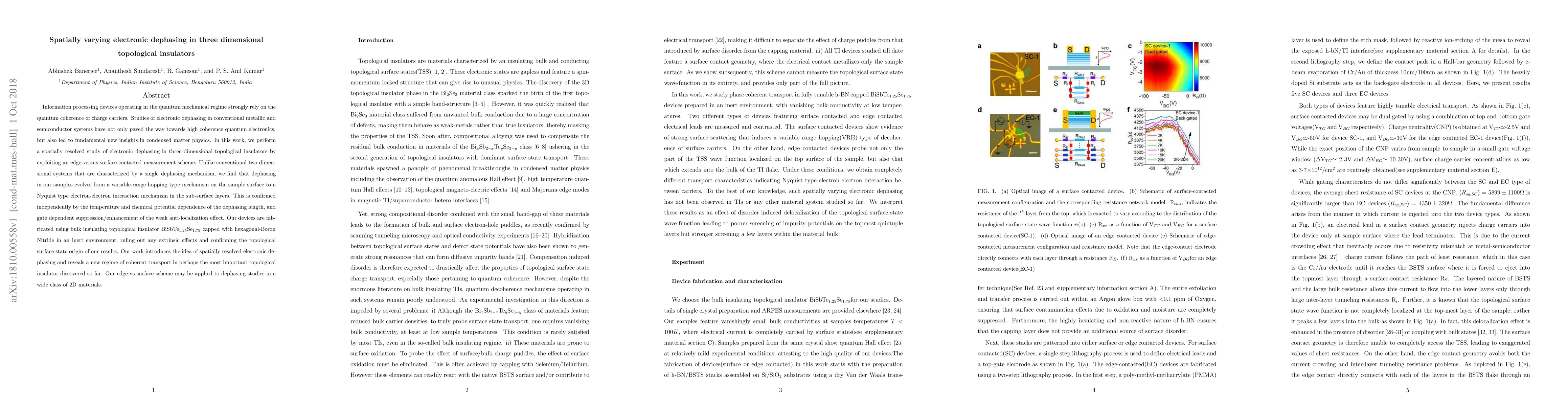 This paper investigates spatially varying electronic dephasing in three-dimensional topological insulators using an edge versus surface contacted measurement scheme. The study reveals distinct dephasing mechanisms on the surface and sub-surface layers, suggesting a new regime of coherent transport in topological insulators.