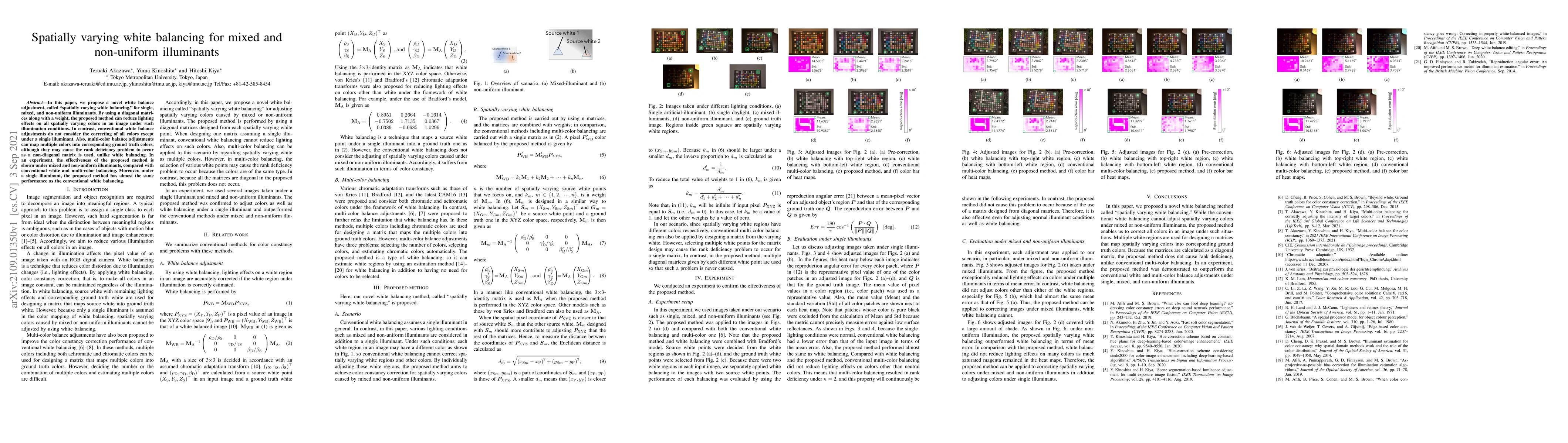 In this paper, we propose a novel white balance adjustment, called "spatially varying white balancing," for single, mixed, and non-uniform illuminants. By using n diagonal matrices along with a weight, the proposed method can reduce lighting effects on all spatially varying colors in an image under such illumination conditions. In contrast, conventional white balance adjustments do not consider the correcting of all colors except under a single illuminant. Also, multi-color balance adjustments can map multiple colors into corresponding ground truth colors, although they may cause the rank deficiency problem to occur as a non-diagonal matrix is used, unlike white balancing. In an experiment, the effectiveness of the proposed method is shown under mixed and non-uniform illuminants, compared with conventional white and multi-color balancing. Moreover, under a single illuminant, the proposed method has almost the same performance as the conventional white balancing.