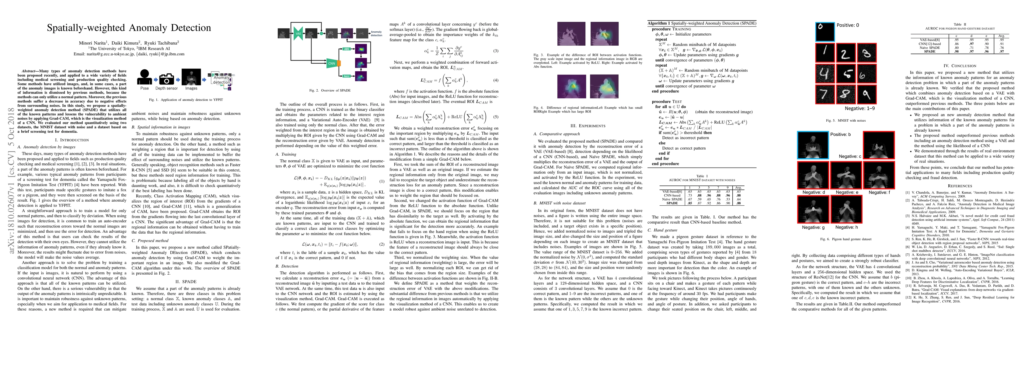 Many types of anomaly detection methods have been proposed recently, and applied to a wide variety of fields including medical screening and production quality checking. Some methods have utilized images, and, in some cases, a part of the anomaly images is known beforehand. However, this kind of information is dismissed by previous methods, because the methods can only utilize a normal pattern. Moreover, the previous methods suffer a decrease in accuracy due to negative effects from surrounding noises. In this study, we propose a spatially-weighted anomaly detection method (SPADE) that utilizes all of the known patterns and lessens the vulnerability to ambient noises by applying Grad-CAM, which is the visualization method of a CNN. We evaluated our method quantitatively using two datasets, the MNIST dataset with noise and a dataset based on a brief screening test for dementia.