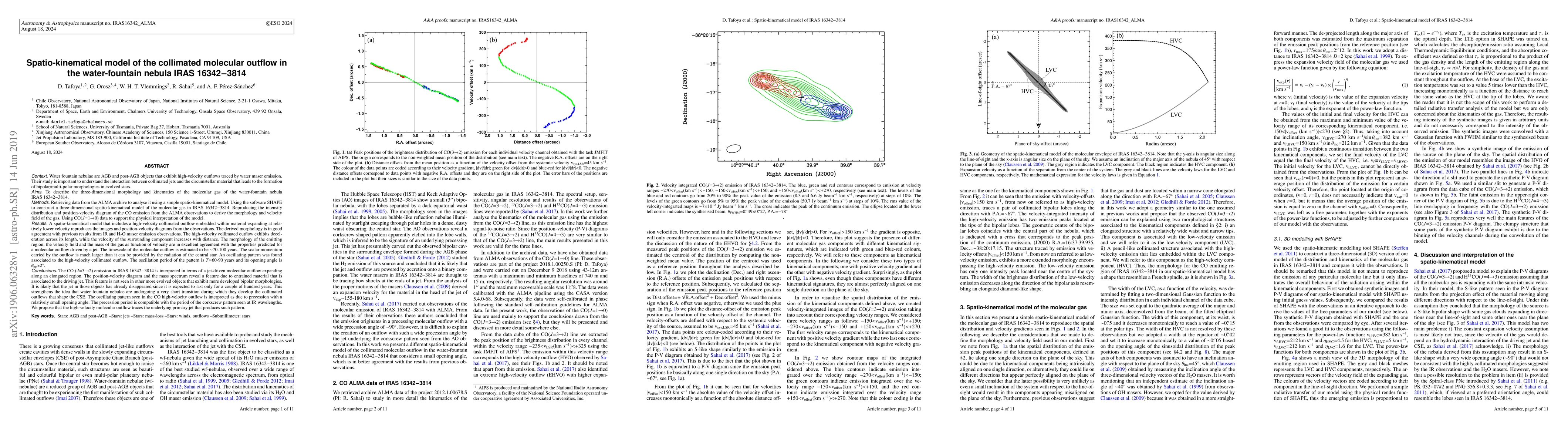 In this work we aimed to describe the three-dimensional morphology and kinematics of the molecular gas of the water-fountain nebula IRAS 16342-3814. In order to do this, we retrieved data from the ALMA archive to analyse it using a simple spatio-kinematical model. We used the software SHAPE to construct a three-dimensional spatio-kinematical model of the molecular gas in IRAS 16342-3814. By reproducing the intensity distribution and position-velocity diagram of the CO emission from the ALMA observations we derived the morphology and velocity field of the gas. We used CO(1-0) data to support the physical interpretation of the model. A spatio-kinematical model that includes a high-velocity collimated outflow embedded within material expanding at relatively lower velocity reproduces the images and position-velocity diagrams from the observations. The high-velocity collimated outflow exhibits deceleration across its length, while the velocity of the surrounding component increases with distance. The morphology of the emitting region; the velocity field and the mass of the gas as function of velocity are in excellent agreement with the properties predicted for a molecular outflow driven by a jet. The timescale of the molecular outflow is estimated to be ~70-100 years. An oscillating pattern was found associated to the high-velocity collimated outflow. The oscillation period of the pattern is T~60-90 years and its opening angle is ~2 degrees. The CO (3-2) emission in IRAS 16342-3814 is interpreted in terms of a jet-driven molecular outflow expanding along an elongated region. The position-velocity diagram and the mass spectrum reveal a feature due to entrained material that is associated to the driving jet. It is likely that the jet in those objects has already disappeared since it is expected to last only for a couple of hundred years.