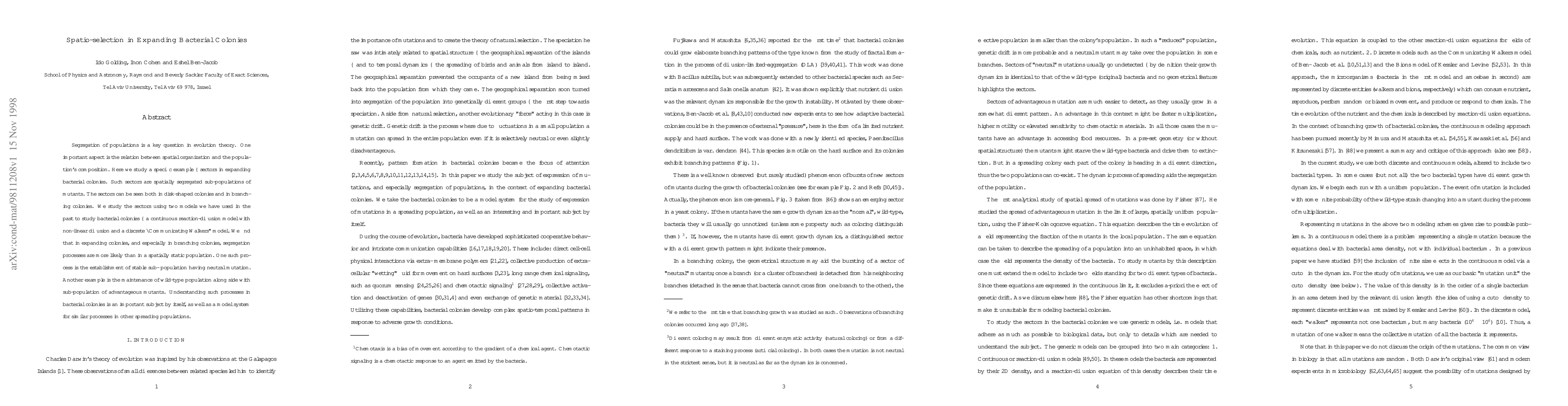Segregation of populations is a key question in evolution theory. One important aspect is the relation between spatial organization and the population's composition. Here we study a specific example -- sectors in expanding bacterial colonies. Such sectors are spatially segregated sub-populations of mutants. The sectors can be seen both in disk-shaped colonies and in branching colonies. We study the sectors using two models we have used in the past to study bacterial colonies -- a continuous reaction-diffusion model with non-linear diffusion and a discrete ``Communicating Walkers'' model. We find that in expanding colonies, and especially in branching colonies, segregation processes are more likely than in a spatially static population. One such process is the establishment of stable sub- population having neutral mutation. Another example is the maintenance of wild-type population along side with sub-population of advantageous mutants. Understanding such processes in bacterial colonies is an important subject by itself, as well as a model system for similar processes in other spreading populations.