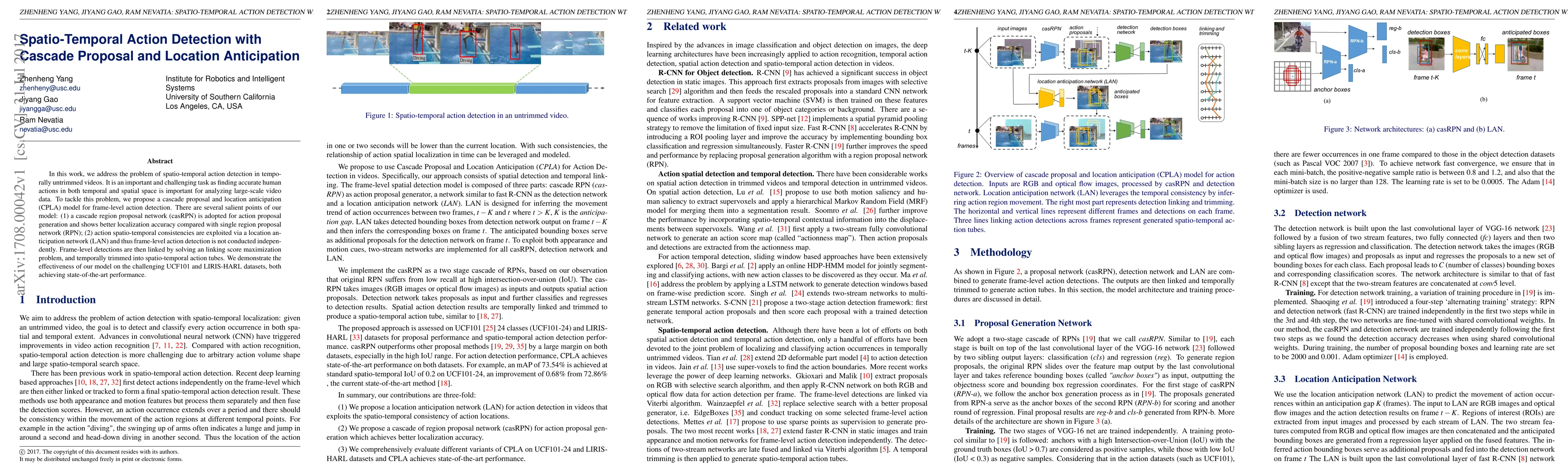 This paper proposes a cascade proposal and location anticipation (CPLA) model for spatio-temporal action detection in untrimmed videos, utilizing a cascade region proposal network for improved localization and a location anticipation network to link frame-level detections into spatio-temporal action tubes, achieving state-of-the-art results on UCF101 and LIRIS-HARL datasets.