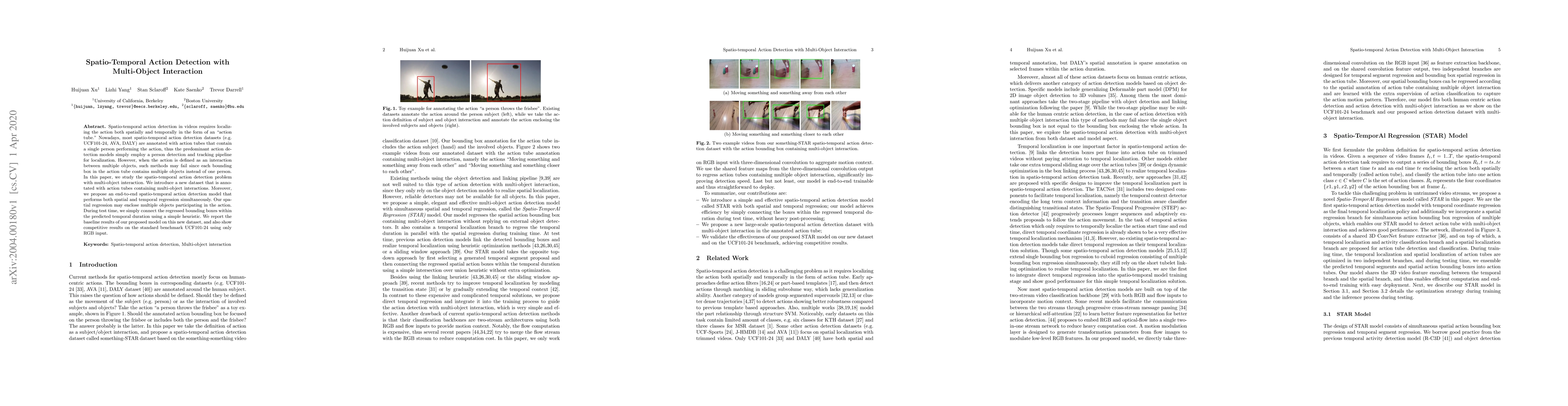 This paper introduces a new dataset for spatio-temporal action detection involving multi-object interactions and proposes an end-to-end model that performs simultaneous spatial and temporal regression to localize actions involving multiple objects. The model shows competitive results on standard benchmarks.