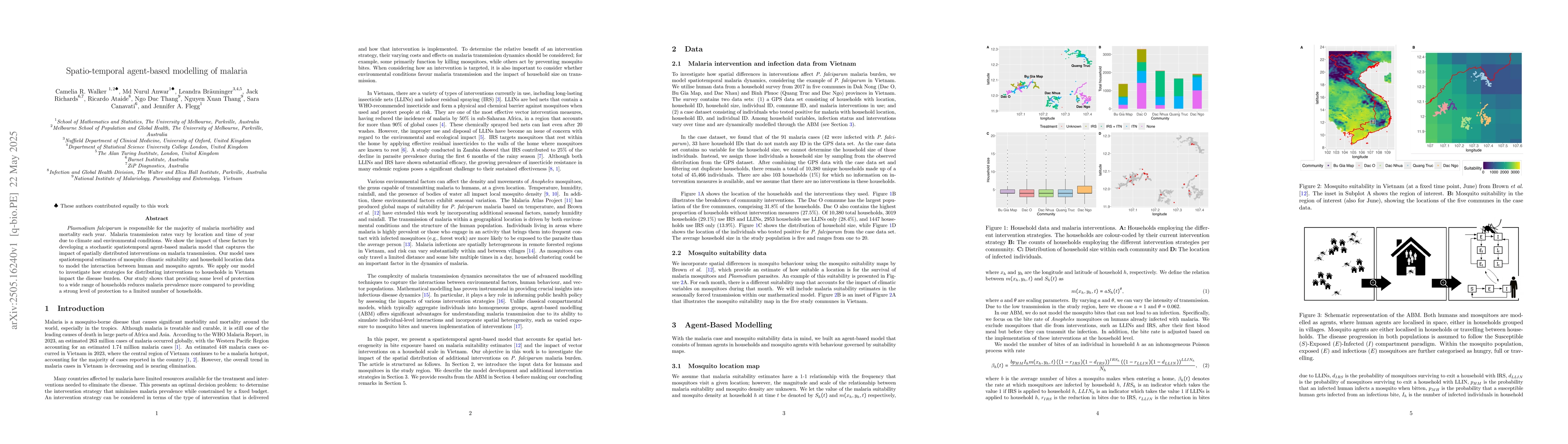 The research develops a stochastic spatiotemporal agent-based malaria model using spatiotemporal estimates of mosquito climatic suitability and household location data to model human-mosquito interactions.