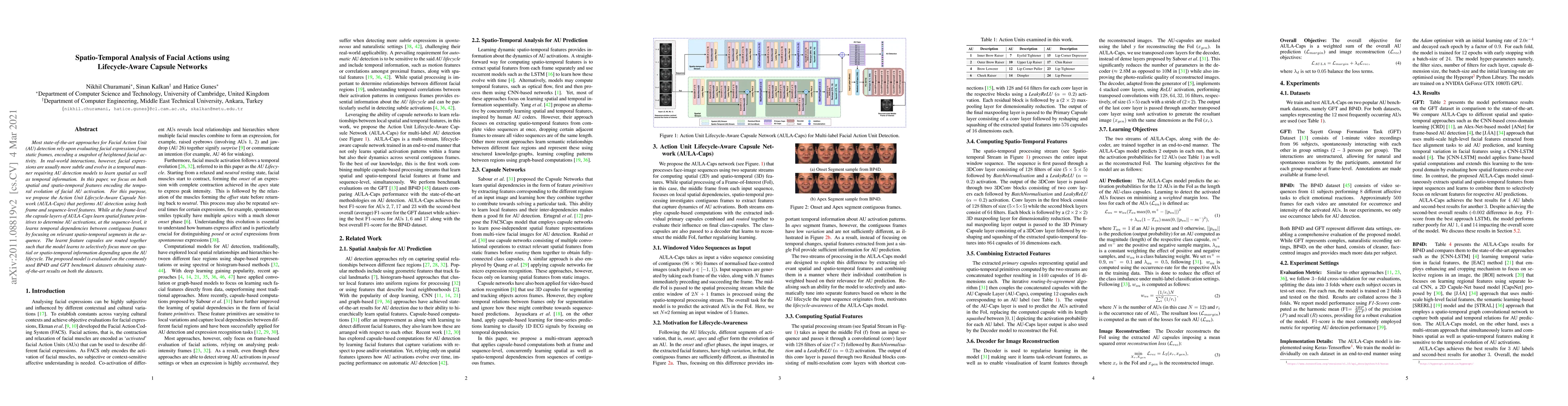 This paper proposes the Action Unit Lifecycle-Aware Capsule Network (AULA-Caps) to detect Facial Action Units (AUs) by encoding spatial and spatio-temporal features. The model achieves state-of-the-art results on BP4D and GFT datasets by focusing on temporal evolution of AUs through frame and sequence-level feature learning.