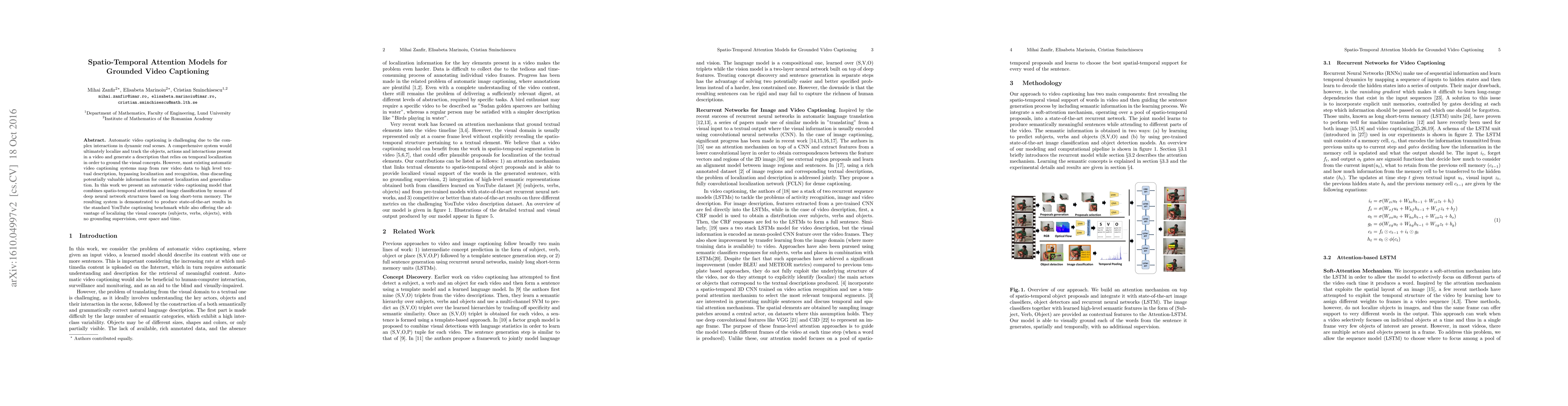 This paper presents a video captioning model that employs spatio-temporal attention and deep neural networks to generate descriptive captions, localizing visual concepts without supervision. The system achieves state-of-the-art results on the YouTube captioning benchmark by integrating object and action tracking into the captioning process.