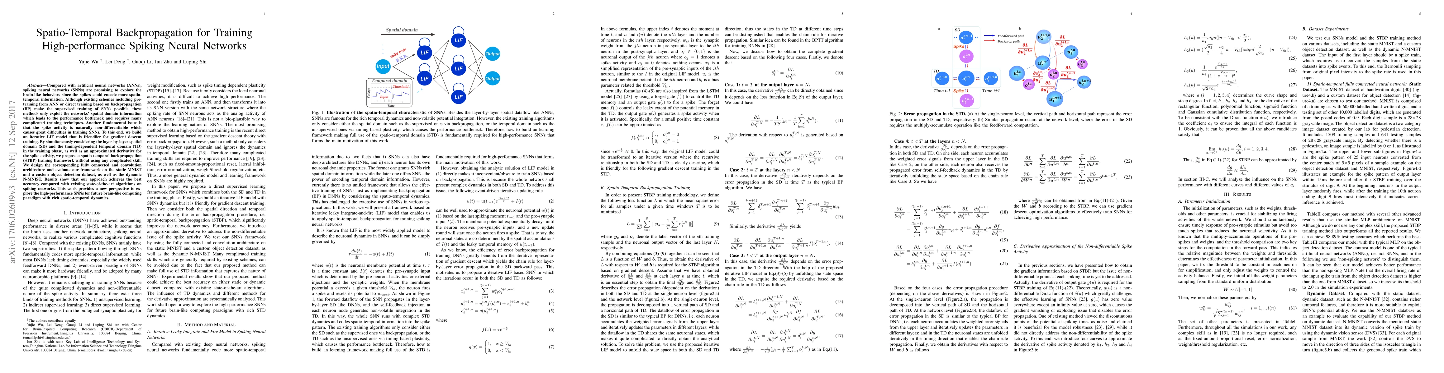This paper proposes a spatio-temporal backpropagation (STBP) framework for training high-performance spiking neural networks (SNNs) by integrating both spatial and temporal domain information, overcoming the non-differentiability of spike activity. The STBP achieves superior performance compared to existing methods on various datasets.