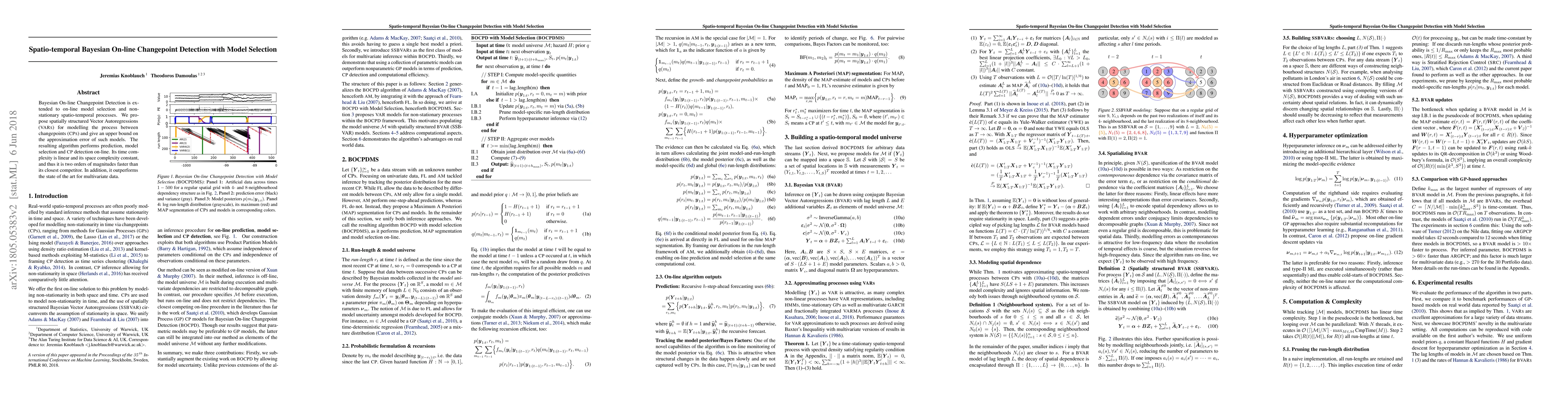 Bayesian On-line Changepoint Detection is extended to on-line model selection and non-stationary spatio-temporal processes. We propose spatially structured Vector Autoregressions (VARs) for modelling the process between changepoints (CPs) and give an upper bound on the approximation error of such models. The resulting algorithm performs prediction, model selection and CP detection on-line. Its time complexity is linear and its space complexity constant, and thus it is two orders of magnitudes faster than its closest competitor. In addition, it outperforms the state of the art for multivariate data.