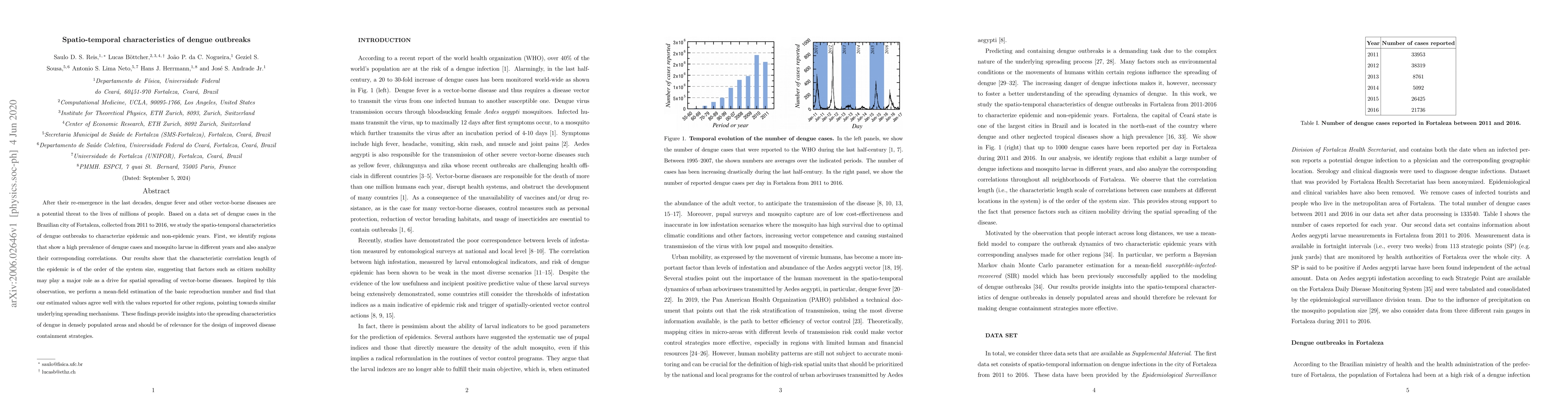 After their re-emergence in the last decades, dengue fever and other vector-borne diseases are a potential threat to the lives of millions of people. Based on a data set of dengue cases in the Brazilian city of Fortaleza, collected from 2011 to 2016, we study the spatio-temporal characteristics of dengue outbreaks to characterize epidemic and non-epidemic years. First, we identify regions that show a high prevalence of dengue cases and mosquito larvae in different years and also analyze their corresponding correlations. Our results show that the characteristic correlation length of the epidemic is of the order of the system size, suggesting that factors such as citizen mobility may play a major role as a drive for spatial spreading of vector-borne diseases. Inspired by this observation, we perform a mean-field estimation of the basic reproduction number and find that our estimated values agree well with the values reported for other regions, pointing towards similar underlying spreading mechanisms. These findings provide insights into the spreading characteristics of dengue in densely populated areas and should be of relevance for the design of improved disease containment strategies.