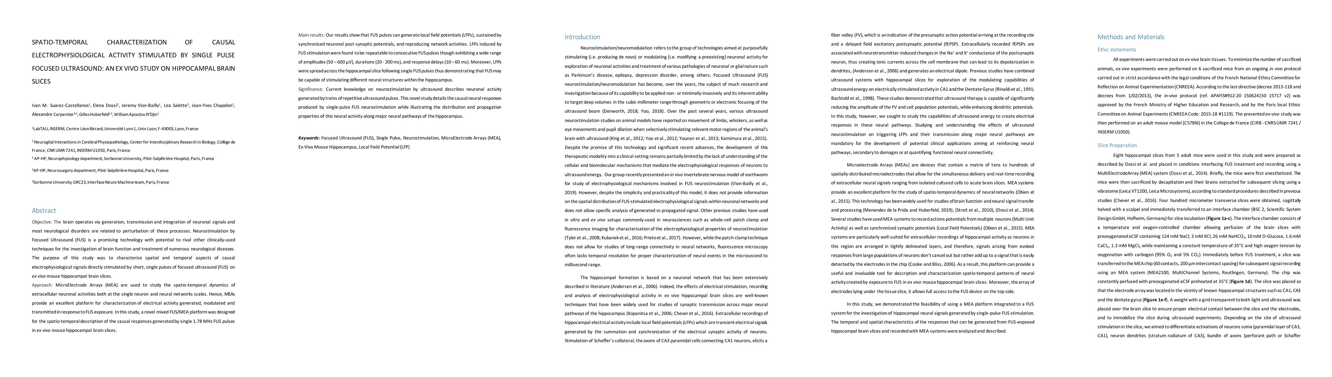 This study characterizes the spatial and temporal dynamics of electrophysiological responses in ex vivo mouse hippocampal slices induced by single-pulse focused ultrasound (FUS). The results show that FUS can generate repeatable local field potentials, indicating synchronized neuronal activity, with varying amplitudes, durations, and delays, demonstrating FUS's potential for stimulating different hippocampal neural structures.