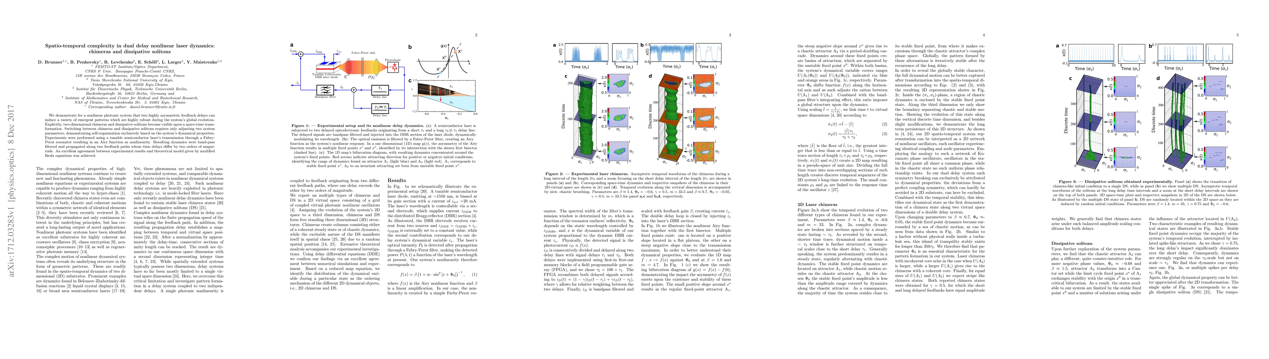 This paper explores how dual delay nonlinear dynamics in photonic systems can generate complex patterns like chimeras and dissipative solitons. Experimental results using a semiconductor laser with significant time delay differences show robust emergent patterns, with theoretical models matching the observed behavior.