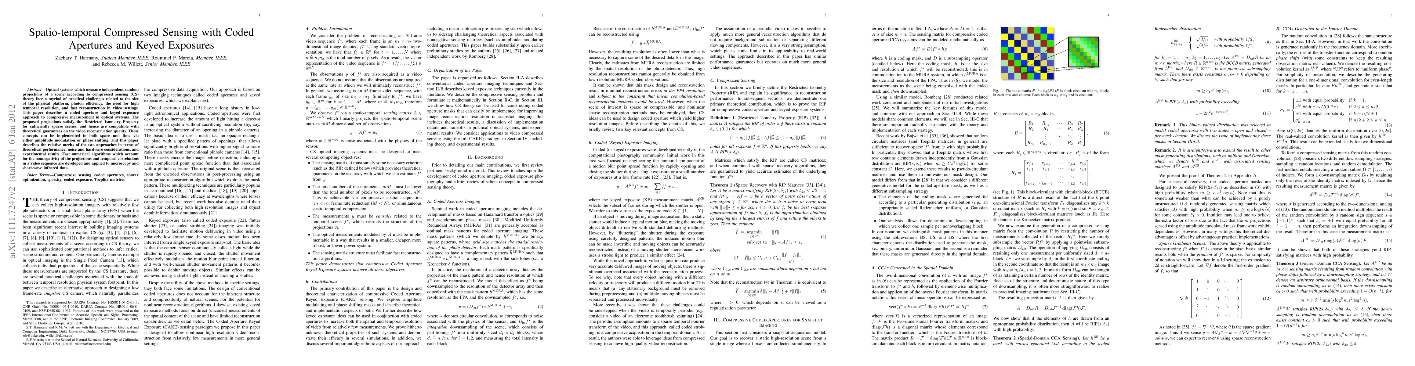 This paper proposes a coded aperture and keyed exposure method for spatio-temporal compressed sensing in optical systems, addressing challenges like platform size and photon efficiency. The approach ensures theoretical reconstruction quality for sparse scenes and is implemented via amplitude or phase modulation, with experimental validation in microscopy and short-wave infrared data.