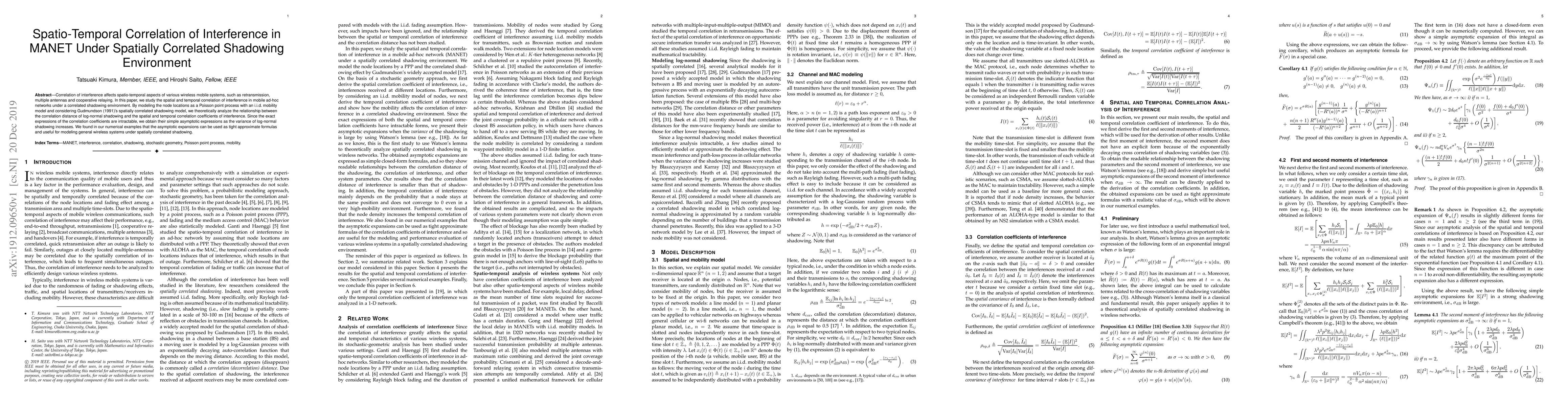 This paper investigates the spatial and temporal correlation of interference in mobile ad-hoc networks under a correlated shadowing environment, using a Poisson point process for node locations and Gudmundson's model for shadowing. It derives asymptotic expressions for correlation coefficients, finding these approximations useful for modeling wireless systems under spatially correlated shadowing.