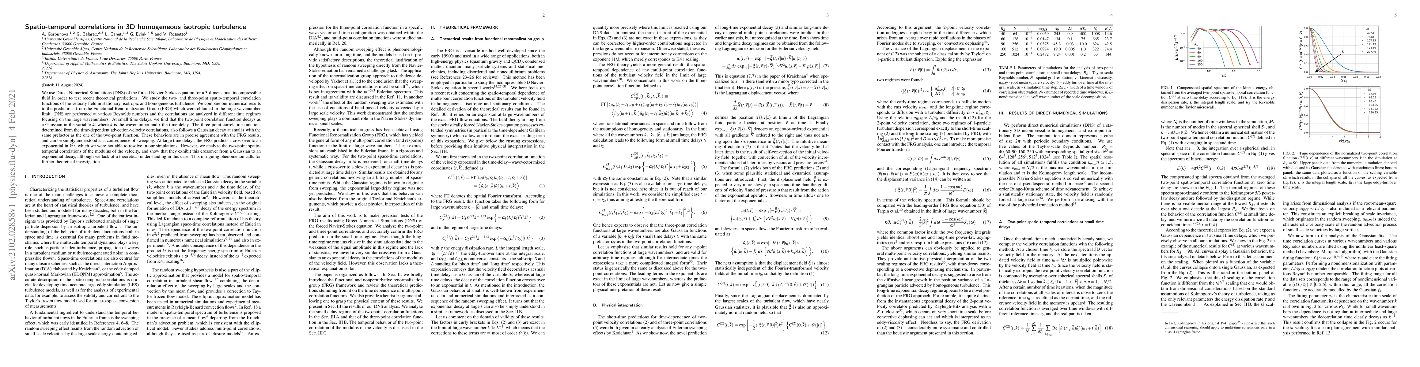 The research uses Direct Numerical Simulations (DNS) of the Navier-Stokes equation to examine spatio-temporal correlations in 3D turbulence. Finding that two- and three-point correlation functions decay gaussially at small time delays, aligning with Functional Renormalization Group (FRG) predictions. At larger time delays, an unexplained crossover from Gaussian to exponential decay in velocity modulus correlations is observed, suggesting areas for further theoretical exploration.
