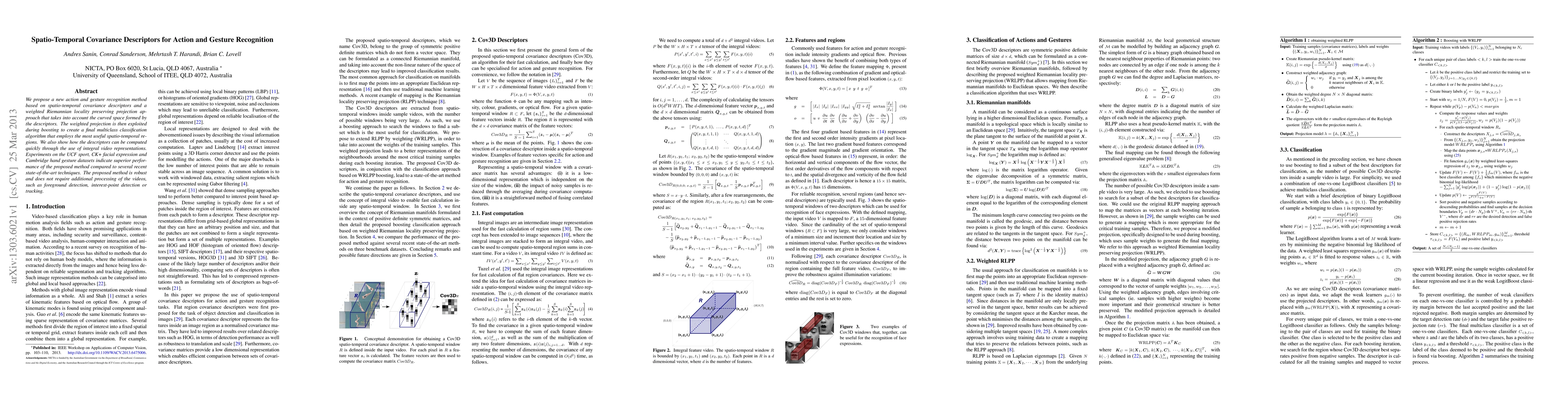 This paper introduces a novel action and gesture recognition method using spatio-temporal covariance descriptors and a weighted Riemannian locality preserving projection. The method demonstrates superior performance on multiple datasets without requiring additional video processing steps.
