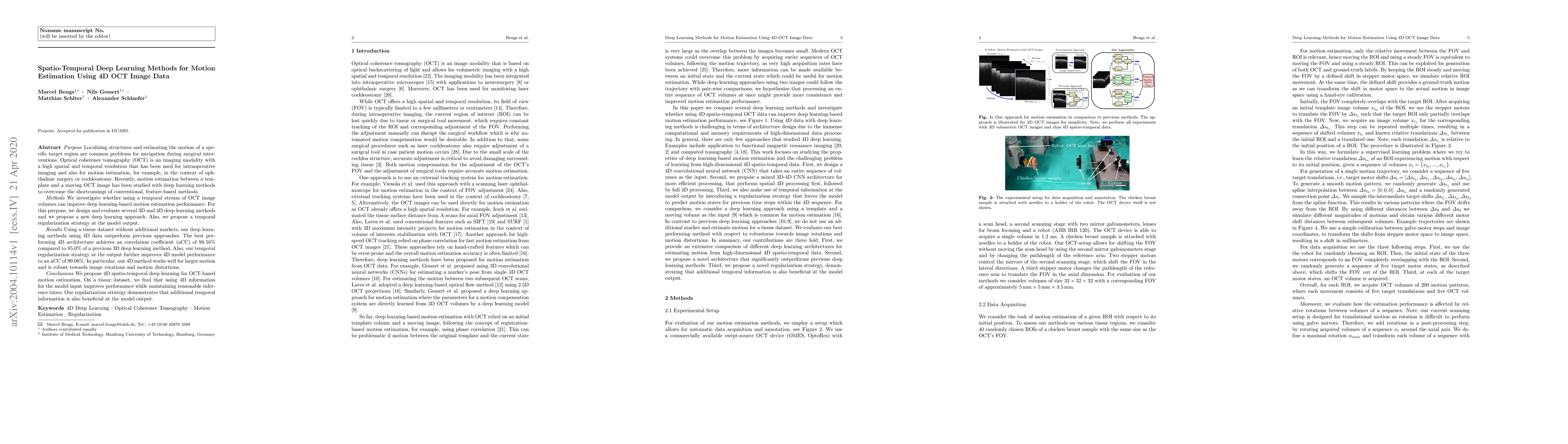 Purpose. Localizing structures and estimating the motion of a specific target region are common problems for navigation during surgical interventions. Optical coherence tomography (OCT) is an imaging modality with a high spatial and temporal resolution that has been used for intraoperative imaging and also for motion estimation, for example, in the context of ophthalmic surgery or cochleostomy. Recently, motion estimation between a template and a moving OCT image has been studied with deep learning methods to overcome the shortcomings of conventional, feature-based methods. Methods. We investigate whether using a temporal stream of OCT image volumes can improve deep learning-based motion estimation performance. For this purpose, we design and evaluate several 3D and 4D deep learning methods and we propose a new deep learning approach. Also, we propose a temporal regularization strategy at the model output. Results. Using a tissue dataset without additional markers, our deep learning methods using 4D data outperform previous approaches. The best performing 4D architecture achieves an correlation coefficient (aCC) of 98.58% compared to 85.0% of a previous 3D deep learning method. Also, our temporal regularization strategy at the output further improves 4D model performance to an aCC of 99.06%. In particular, our 4D method works well for larger motion and is robust towards image rotations and motion distortions. Conclusions. We propose 4D spatio-temporal deep learning for OCT-based motion estimation. On a tissue dataset, we find that using 4D information for the model input improves performance while maintaining reasonable inference times. Our regularization strategy demonstrates that additional temporal information is also beneficial at the model output.