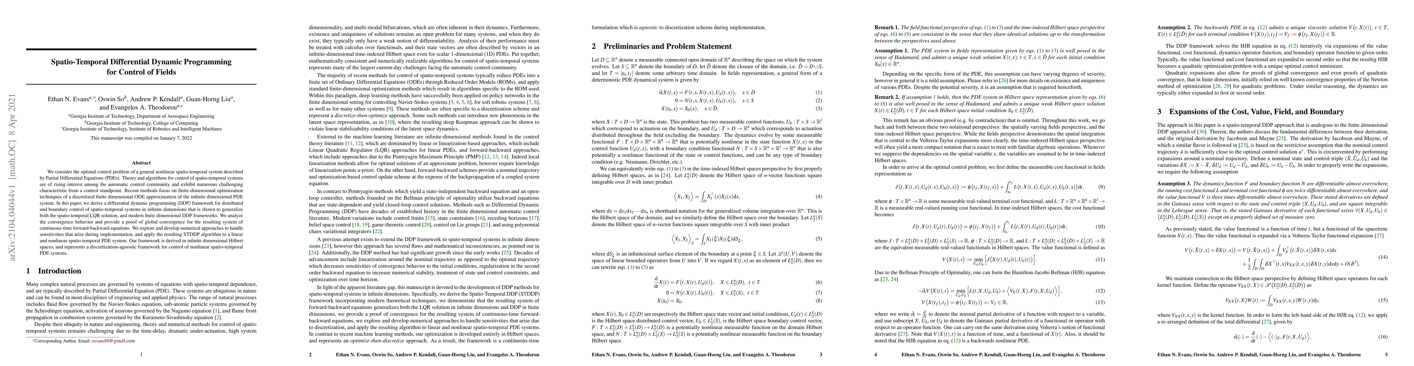 The paper presents a differential dynamic programming (DDP) framework for infinite-dimensional spatio-temporal systems, generalizing existing finite-dimensional DDP methods and spatio-temporal LQR solutions.