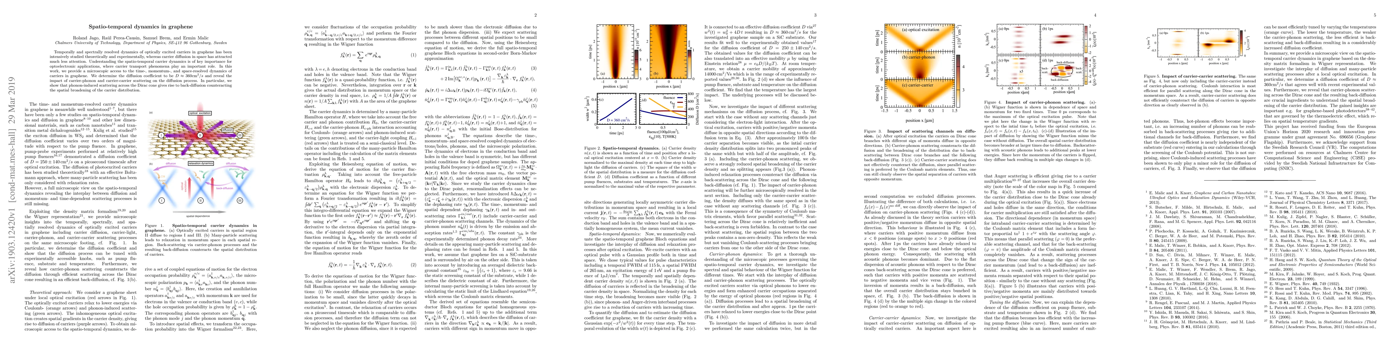 Researchers studied graphene's carrier dynamics, finding a diffusion coefficient of 360cm^2/s and highlighting phonon-induced scattering that affects carrier transport.