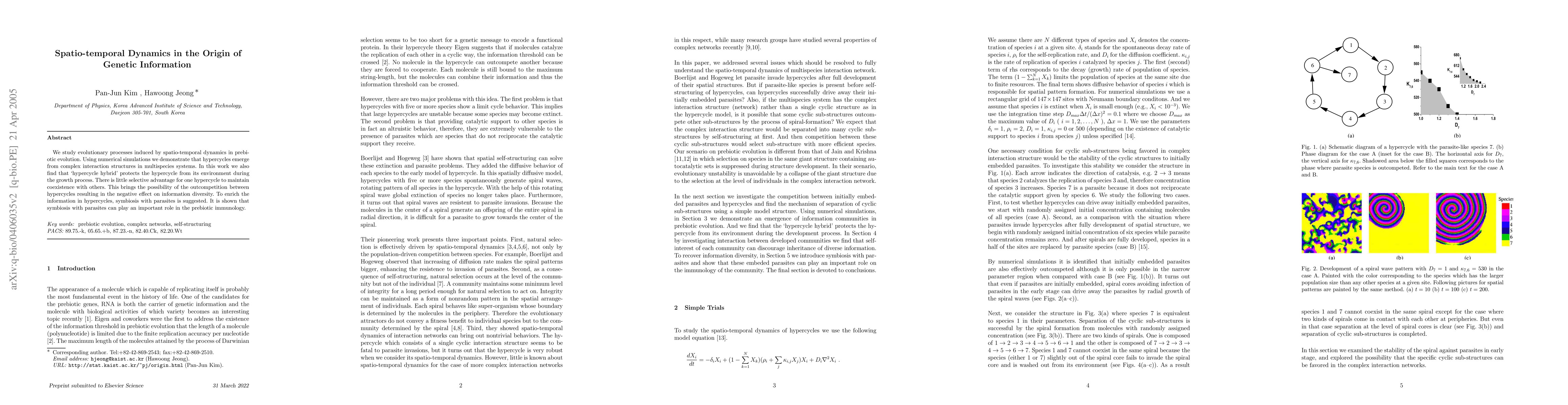 We study evolutionary processes induced by spatio-temporal dynamics in prebiotic evolution. Using numerical simulations we demonstrate that hypercycles emerge from complex interaction structures in multispecies systems. In this work we also find that `hypercycle hybrid' protects the hypercycle from its environment during the growth process. There is little selective advantage for one hypercycle to maintain coexistence with others. This brings the possibility of the outcompetition between hypercycles resulting in the negative effect on information diversity. To enrich the information in hypercycles, symbiosis with parasites is suggested. It is shown that symbiosis with parasites can play an important role in the prebiotic immunology.