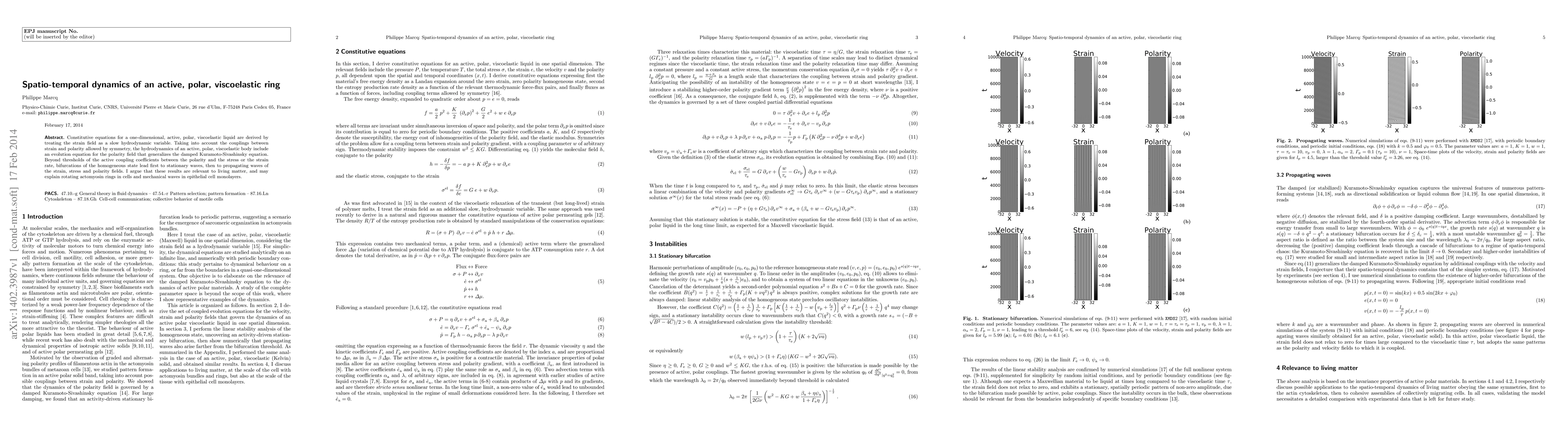 This paper derives constitutive equations for an active, polar, viscoelastic liquid, revealing how strain and polarity fields interact. It finds that beyond certain thresholds, the system undergoes bifurcations leading to stationary and then propagating waves, which may explain phenomena like rotating actomyosin rings and mechanical waves in epithelial cells.