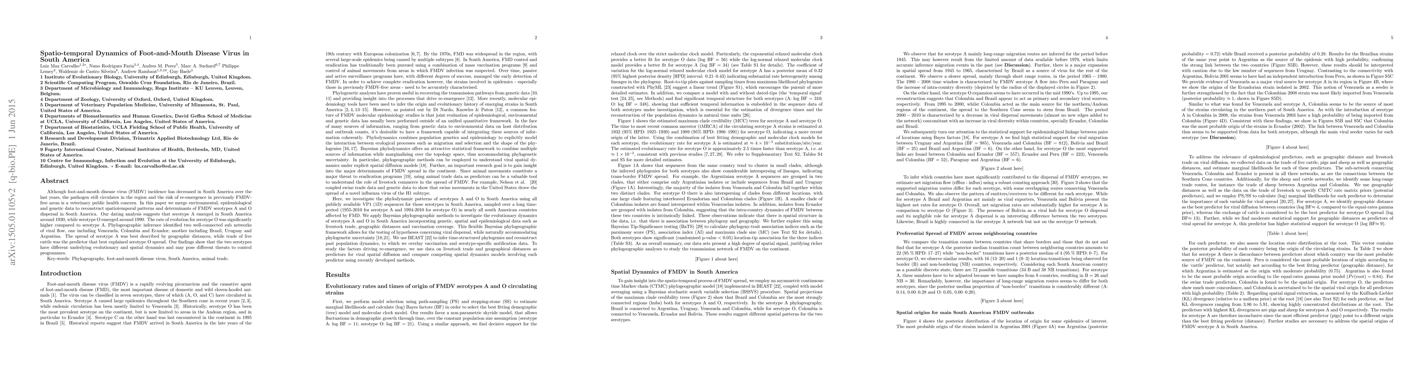 Although foot-and-mouth disease virus (FMDV) incidence has decreased in South America over the last years, the pathogen still circulates in the region and the risk of re-emergence in previously FMDV-free areas is a veterinary public health concern. In this paper we merge environmental, epidemiological and genetic data to reconstruct spatiotemporal patterns and determinants of FMDV serotypes A and O dispersal in South America. Our dating analysis suggests that serotype A emerged in South America around 1930, while serotype O emerged around 1990. The rate of evolution for serotype A was significantly higher compared to serotype O. Phylogeographic inference identified two well-connected sub networks of viral flow, one including Venezuela, Colombia and Ecuador; another including Brazil, Uruguay and Argentina. The spread of serotype A was best described by geographic distances, while trade of live cattle was the predictor that best explained serotype O spread. Our findings show that the two serotypes have different underlying evolutionary and spatial dynamics and may pose different threats to control programmes. Key-words: Phylogeography, foot-and-mouth disease virus, South America, animal trade.