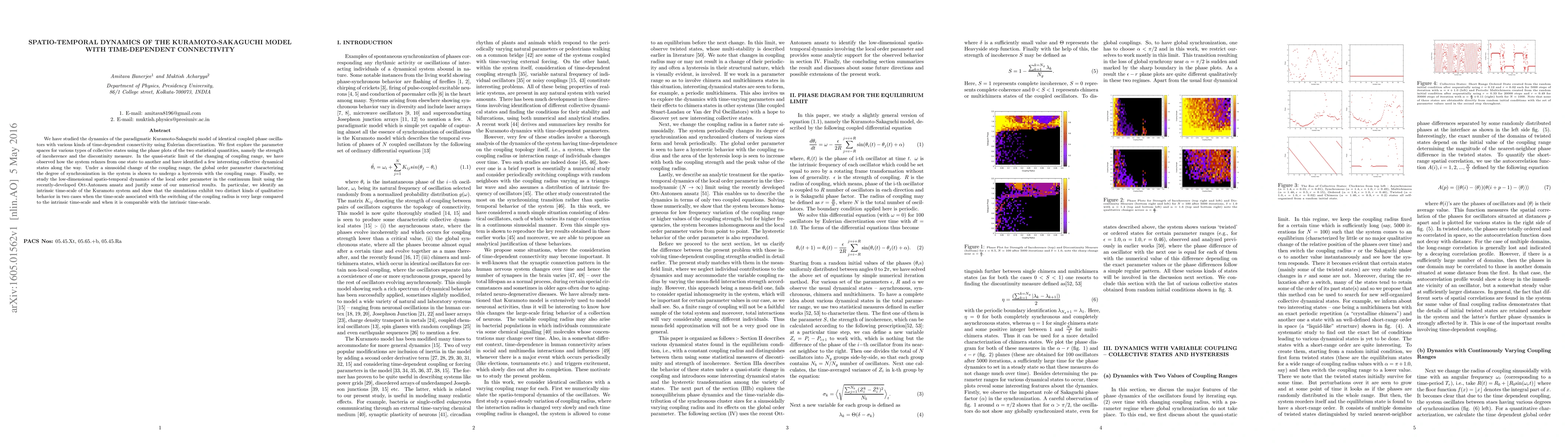 This study investigates the Kuramoto-Sakaguchi model with time-varying connections, employing Eulerian discretization and the Ott-Antonsen ansatz. Key findings include the identification of various collective states, observation of system relaxation in quasi-static limits, and discovery of hysteresis in the global order parameter under sinusoidal coupling range changes. Two distinct dynamical behaviors are identified based on the time-scale of coupling radius switching relative to the system's intrinsic time-scale.