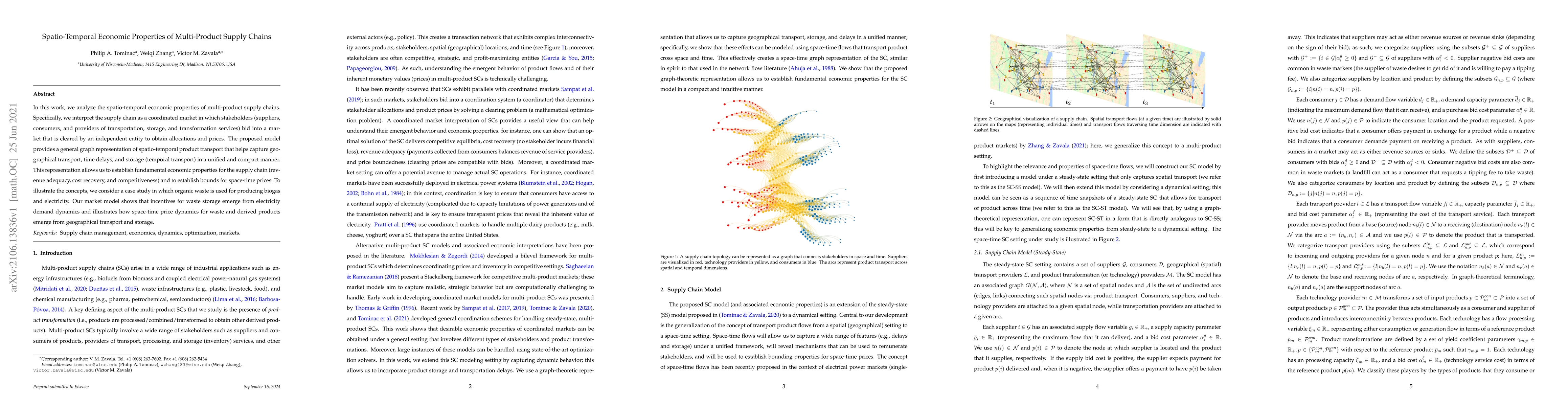 In this work, we analyze the spatio-temporal economic properties of multi-product supply chains. Specifically, we interpret the supply chain as a coordinated market in which stakeholders (suppliers, consumers, and providers of transportation, storage, and transformation services) bid into a market that is cleared by an independent entity to obtain allocations and prices. The proposed model provides a general graph representation of spatio-temporal product transport that helps capture geographical transport, time delays, and storage (temporal transport) in a unified and compact manner. This representation allows us to establish fundamental economic properties for the supply chain (revenue adequacy, cost recovery, and competitiveness) and to establish bounds for space-time prices. To illustrate the concepts, we consider a case study in which organic waste is used for producing biogas and electricity. Our market model shows that incentives for waste storage emerge from electricity demand dynamics and illustrates how space-time price dynamics for waste and derived products emerge from geographical transport and storage.