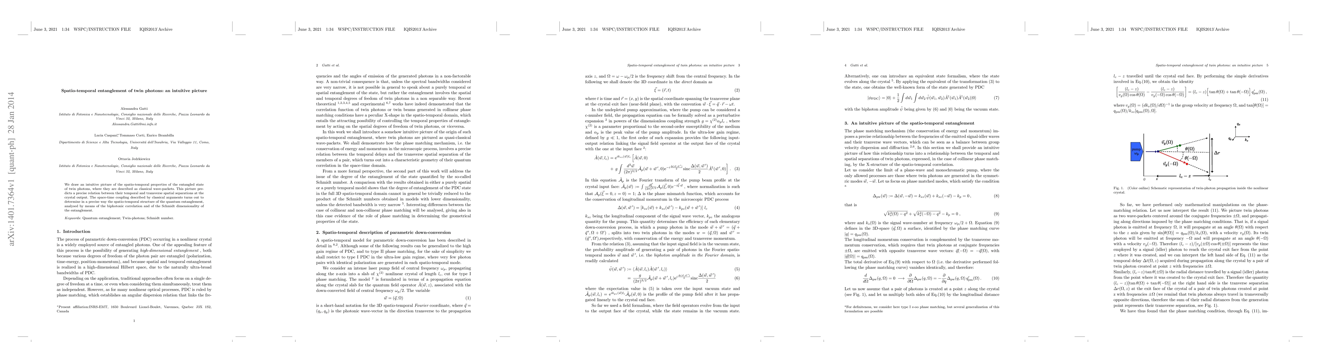 We draw an intuitive picture of the spatio-temporal properties of the entangled state of twin photons, where they are described as classical wave-packets. This picture predicts a precise relation between their temporal and transverse spatial separations at the crystal output. The space-time coupling described by classical arguments turns out to determine in a precise way the spatio-temporal structure of the quantum entanglement, analysed by means of the biphotonic correlation and of the Schmidt dimensionality of the entanglement.