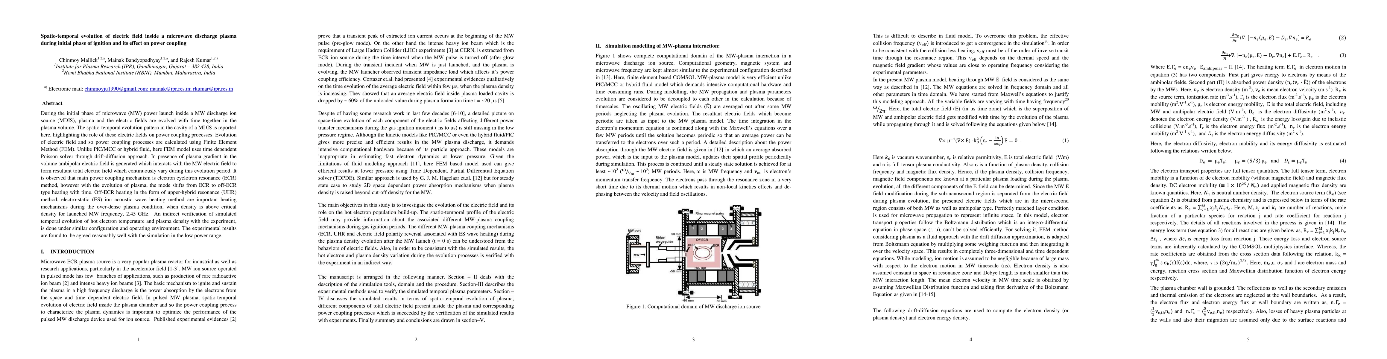 During the initial phase of microwave (MW) power launch inside a MW discharge ion source (MDIS), plasma and the electric fields are evolved with time together in the plasma volume. The spatio-temporal evolution pattern in the cavity of a MDIS is reported here, highlighting the role of these electric fields on power coupling processes. Evolution of electric field and so power coupling processes are calculated using Finite Element Method (FEM). Unlike PIC/MCC or hybrid fluid, here FEM model uses time dependent Poisson solver through drift-diffusion approach. In presence of plasma gradient in the volume ambipolar electric field is generated which interacts with the MW electric field to form resultant total electric field which continuously vary during this evolution period. It is observed that main power coupling mechanism is electron cyclotron resonance (ECR) method, however with the evolution of plasma, the mode shifts from ECR to off-ECR type heating with time. Off-ECR heating in the form of upper-hybrid resonance (UHR) method, electro-static (ES) ion acoustic wave heating method are important heating mechanisms during the over-dense plasma condition, when density is above critical density for launched MW frequency, 2.45 GHz. An indirect verification of simulated temporal evolution of hot electron temperature and plasma density with the experiment, is done under similar configuration and operating environment. The experimental results are found to be agreed reasonably well with the simulation in the low power range.