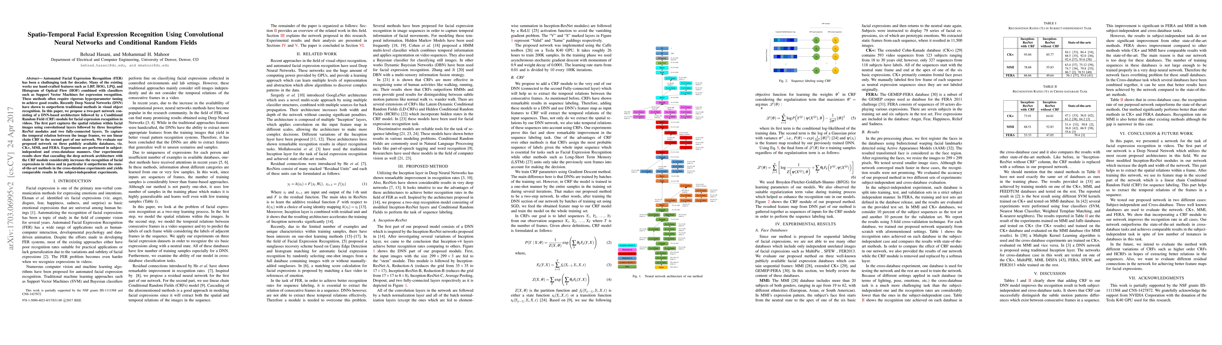This paper proposes a novel two-part network for spatio-temporal facial expression recognition using Convolutional Neural Networks (CNN) and Conditional Random Fields (CRF). The CNN captures spatial relations, while the CRF module captures temporal relations between frames, significantly improving recognition performance over state-of-the-art methods in cross-database experiments.