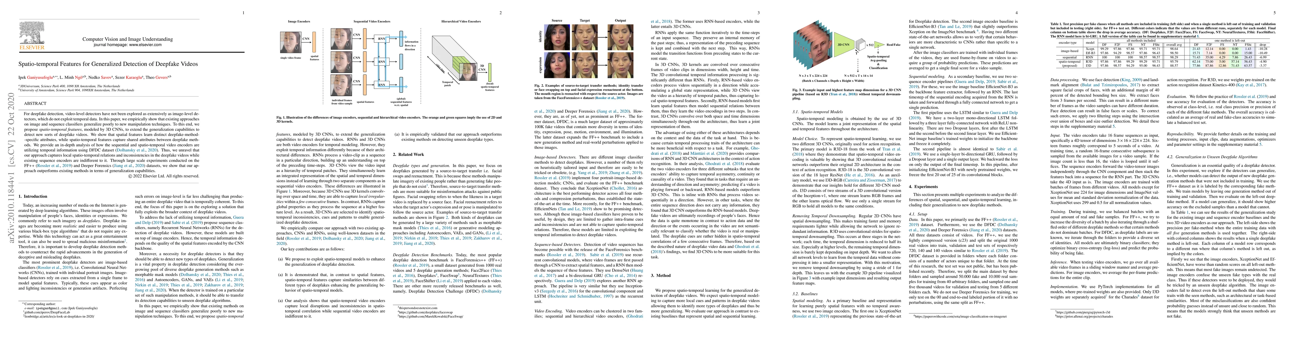 For deepfake detection, video-level detectors have not been explored as extensively as image-level detectors, which do not exploit temporal data. In this paper, we empirically show that existing approaches on image and sequence classifiers generalize poorly to new manipulation techniques. To this end, we propose spatio-temporal features, modeled by 3D CNNs, to extend the generalization capabilities to detect new sorts of deepfake videos. We show that spatial features learn distinct deepfake-method-specific attributes, while spatio-temporal features capture shared attributes between deepfake methods. We provide an in-depth analysis of how the sequential and spatio-temporal video encoders are utilizing temporal information using DFDC dataset arXiv:2006.07397. Thus, we unravel that our approach captures local spatio-temporal relations and inconsistencies in the deepfake videos while existing sequence encoders are indifferent to it. Through large scale experiments conducted on the FaceForensics++ arXiv:1901.08971 and Deeper Forensics arXiv:2001.03024 datasets, we show that our approach outperforms existing methods in terms of generalization capabilities.