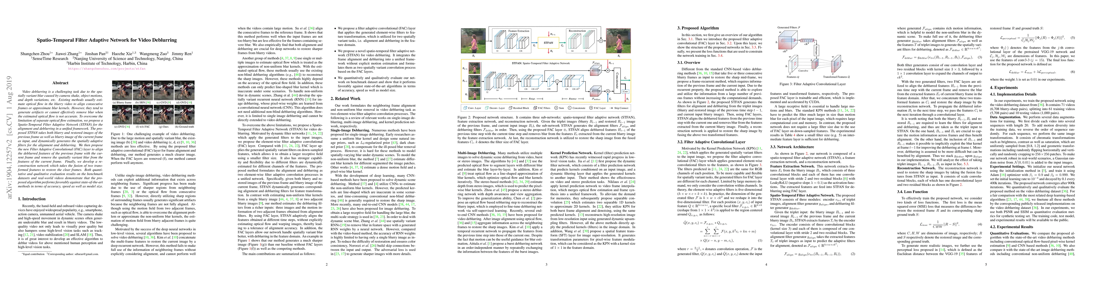 The Spatio-Temporal Filter Adaptive Network (STFAN) proposes a unified framework for video deblurring by dynamically generating adaptive filters to align and deblur frames, using a new Filter Adaptive Convolutional layer to enhance feature alignment and reduce blur. The method outperforms existing techniques in accuracy, speed, and model size.