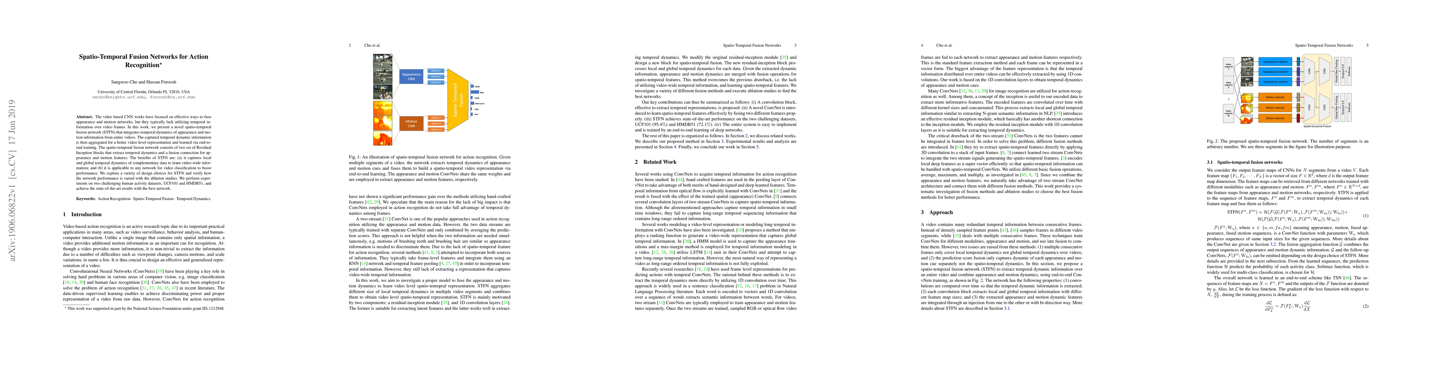 A new spatio-temporal fusion network (STFN) is proposed for action recognition, which combines appearance and motion information from entire videos for better performance. It achieves state-of-the-art results on two challenging human activity datasets, UCF101 and HMDB51.