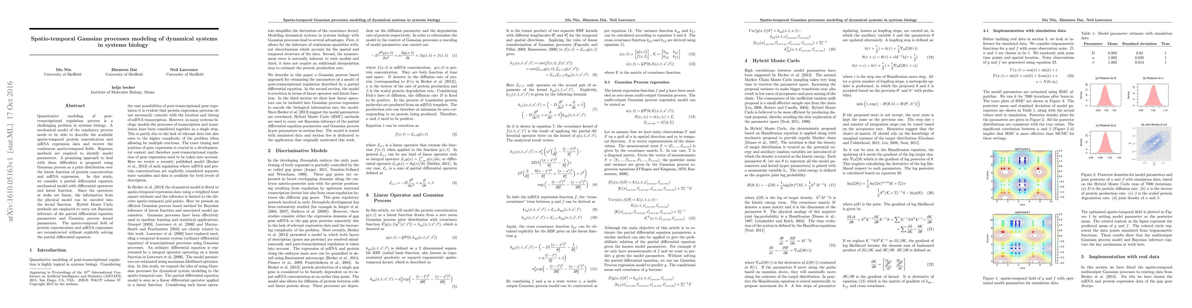 This paper proposes a Gaussian process modeling approach to quantitatively describe the spatio-temporal dynamics of post-transcriptional regulation in systems biology. It employs Bayesian inference and hybrid Monte Carlo methods to infer parameters for a partial differential equation model, reconstructing protein concentration and mRNA expression fields without explicitly solving the equation.