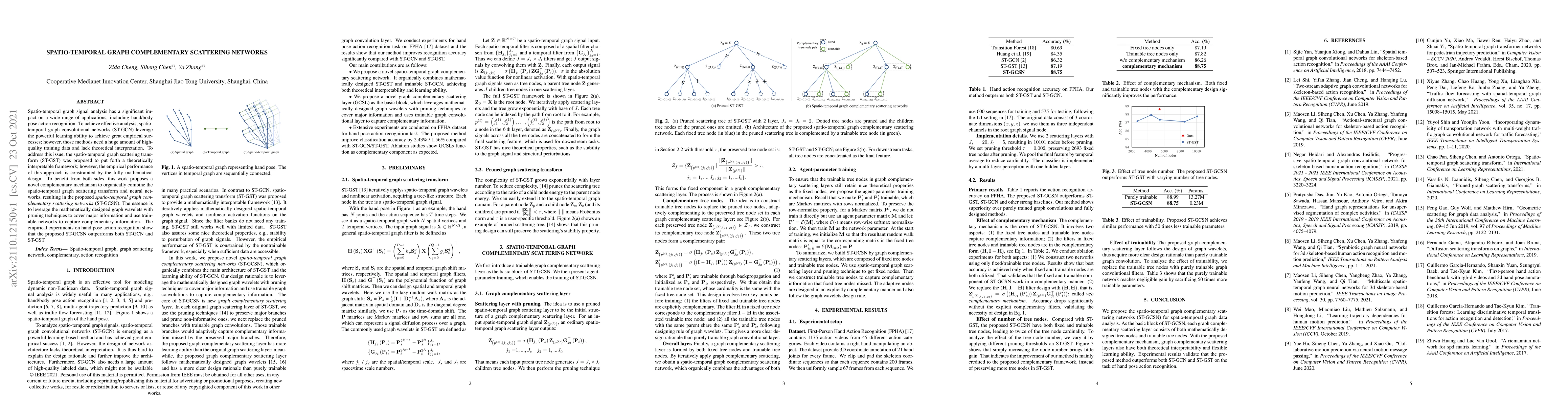 This paper introduces spatio-temporal graph complementary scattering networks (ST-GCSN) to combine the theoretical interpretability of the spatio-temporal graph scattering transform (ST-GST) with the empirical success of spatio-temporal graph convolutional networks (ST-GCN), achieving superior performance in hand pose action recognition tasks.